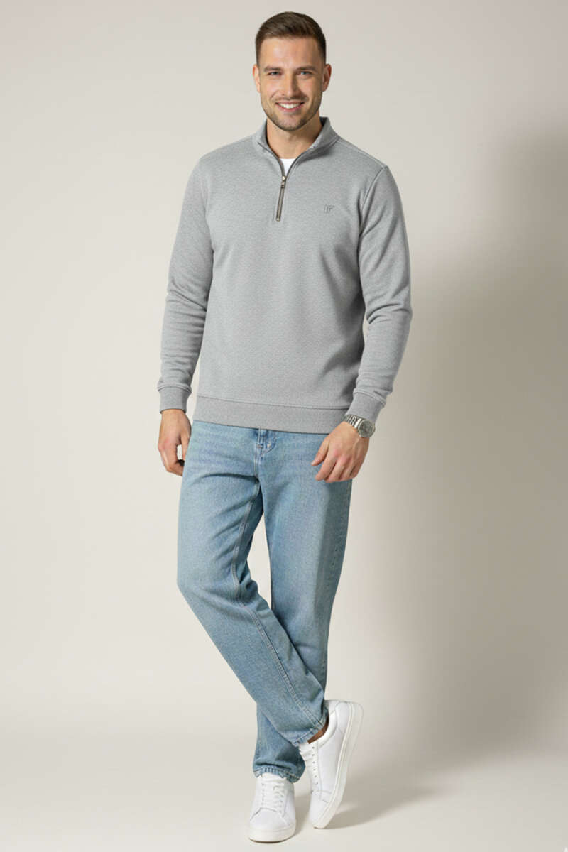 Polo Yaka Fermuarlı Basic Erkek Sweatshirt Taş