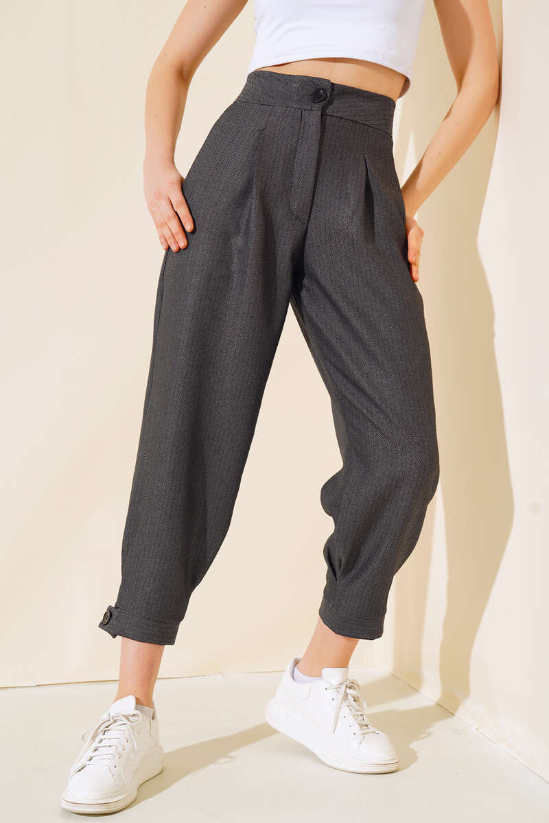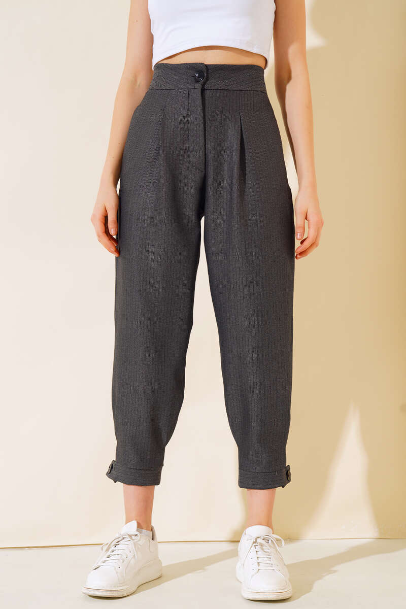 Yeni sezon pantolon modelimizle tüm kombinlerinde rahat ve şık olma şansını yakala. Pantolonumuzun önü pilelidir. Paçası düğmelidir. Dar paça modeldir. İki adet cebi bulunmaktadır.
