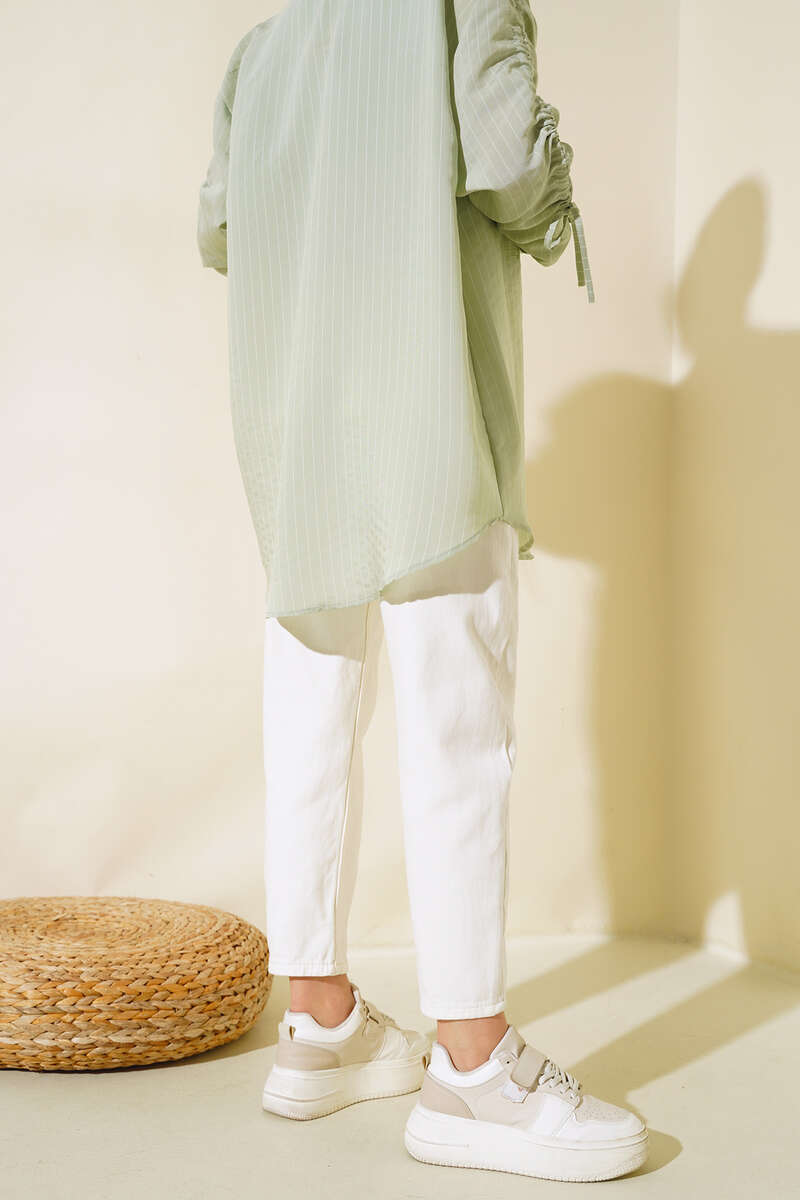 Yeni sezon jean pantolon paçası pens detaylıdır. Belinde de pens detayları bulunan pantolonumuz dar paçadır. Yüksek bel olan pantolonumuz düğmeli ve fermuarlıdır. Beş adet kemer köprüsü bulunan pantolonumuz ön ve arka ceplere sahiptir.