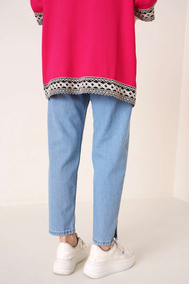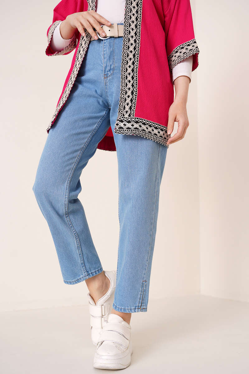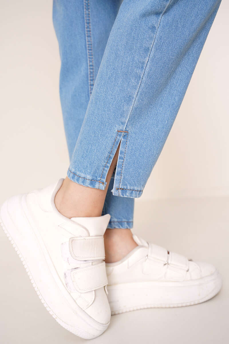 Yeni sezon jean pantolon paça yırtmaçlıdır. Jean pantolonumuz boyfriend modeldir. İki adet önünde iki adet arkasında olmak üzer dört adet cebi bulunmaktadır. Beş kemer köpürülü pantolonumuz düğmeli ve fermuarlıdır.