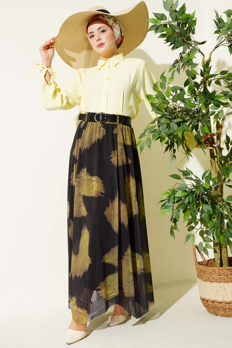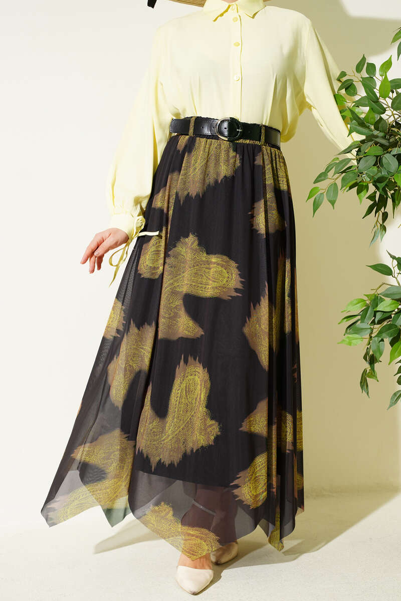 Paisley Desen Asimetrik Tül Etek Siyah