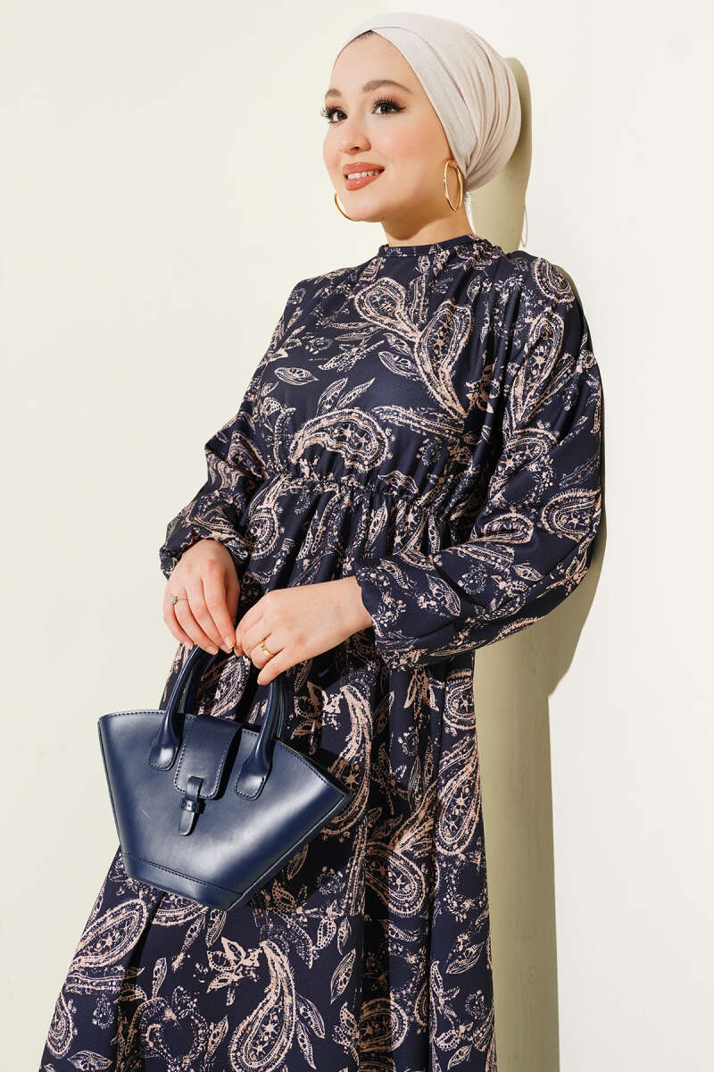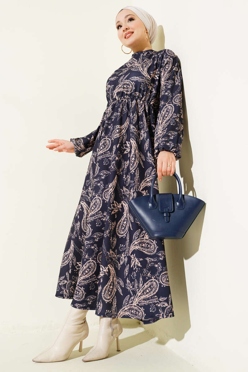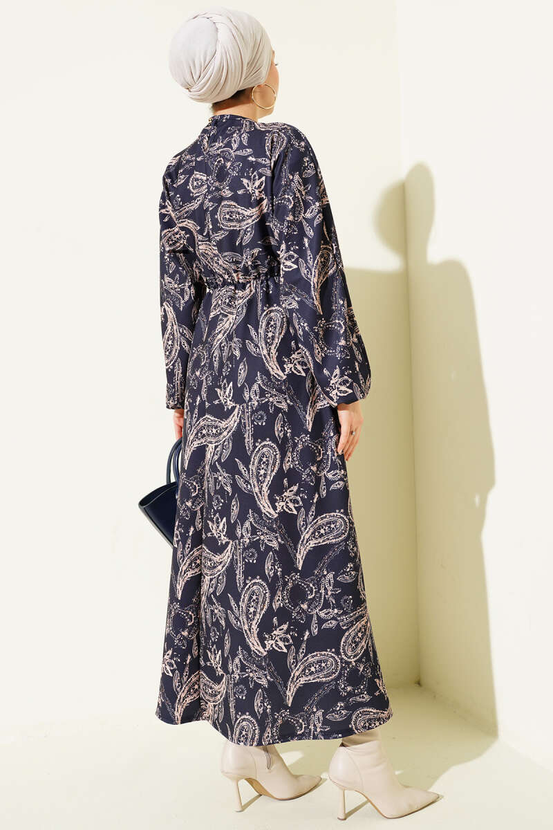 Paisley Desen Bel Lastikli Elbise İndigo