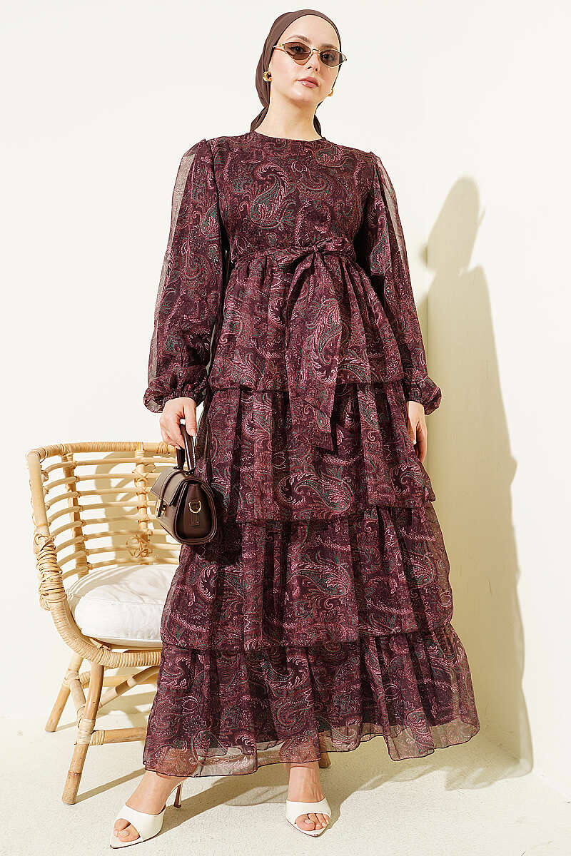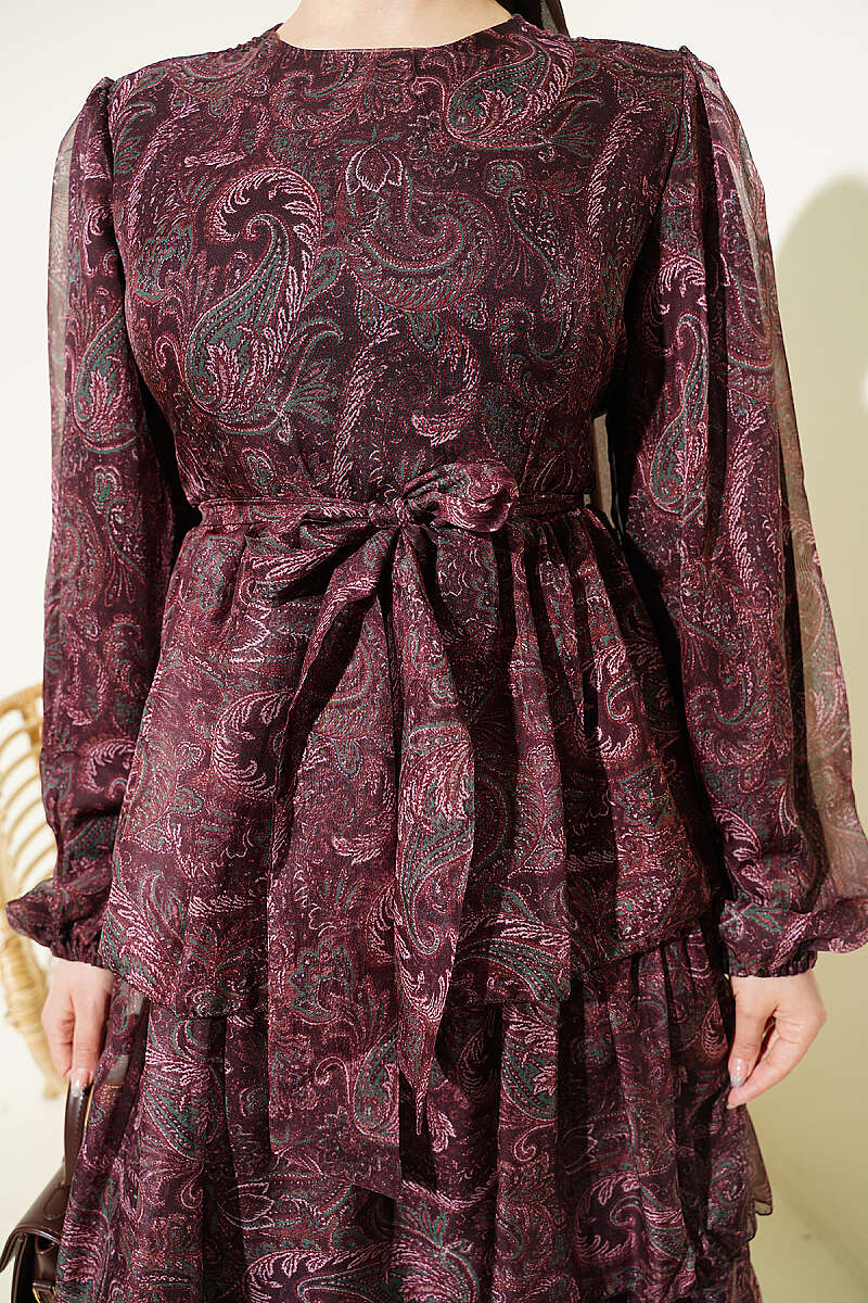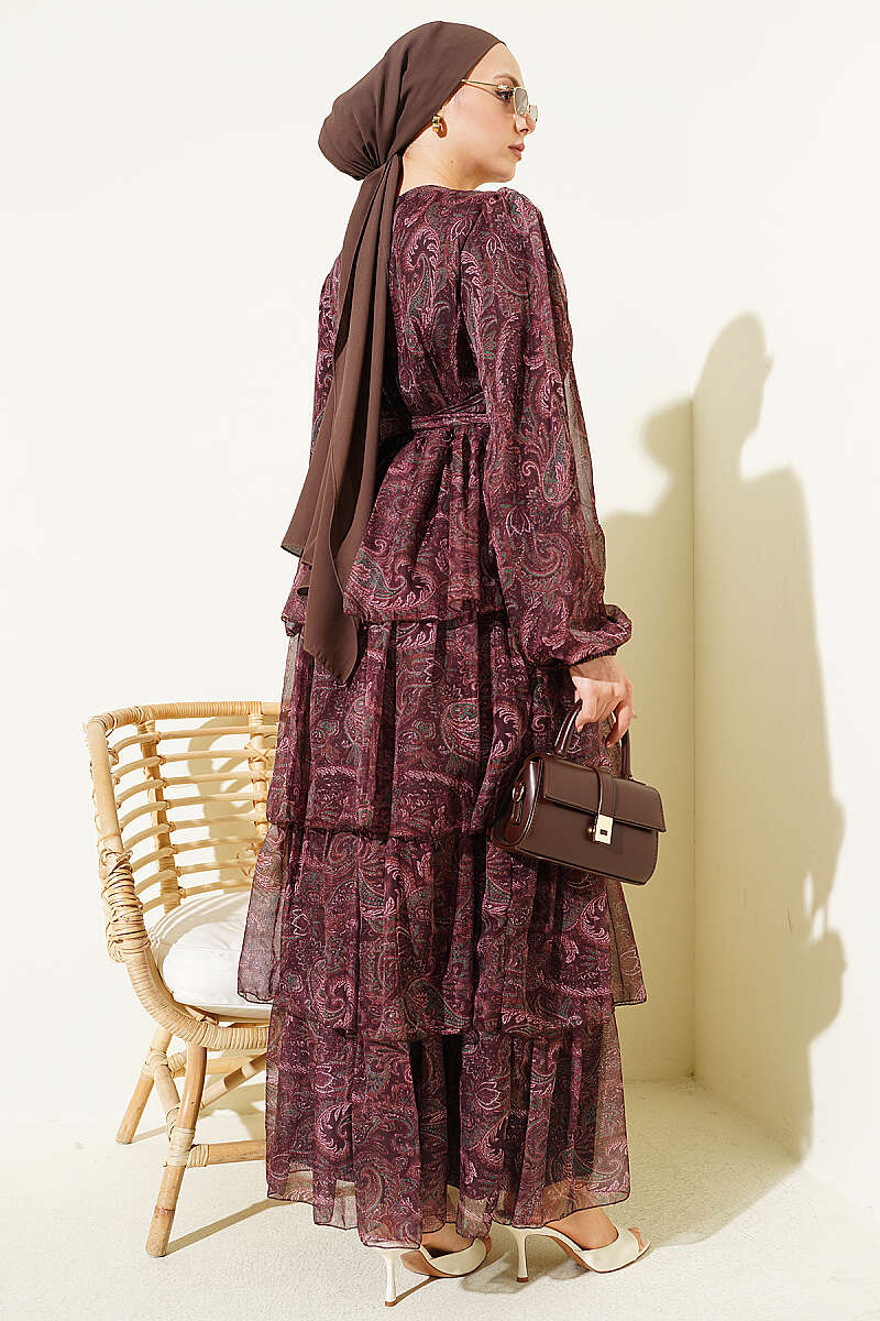 Paisley Desen Kat Kat Şifon Elbise Kahve