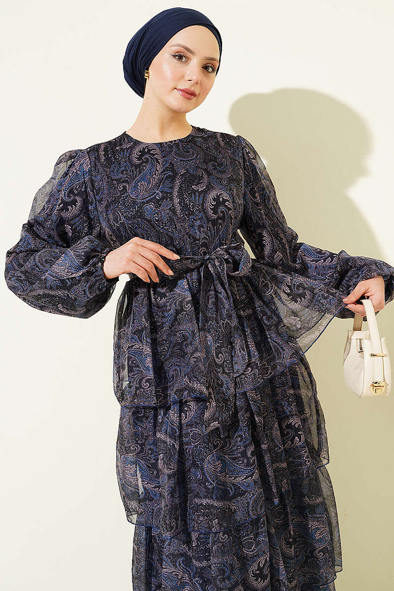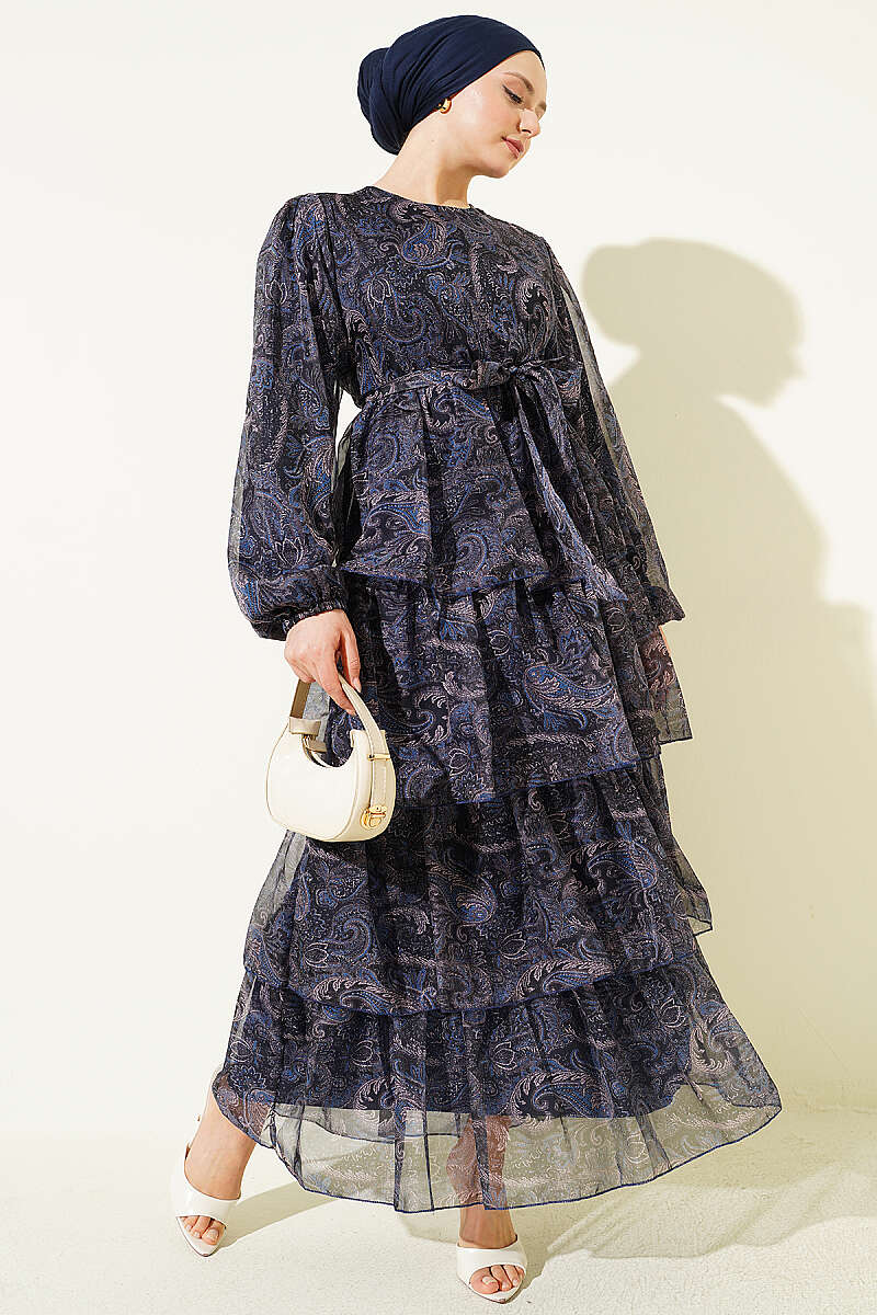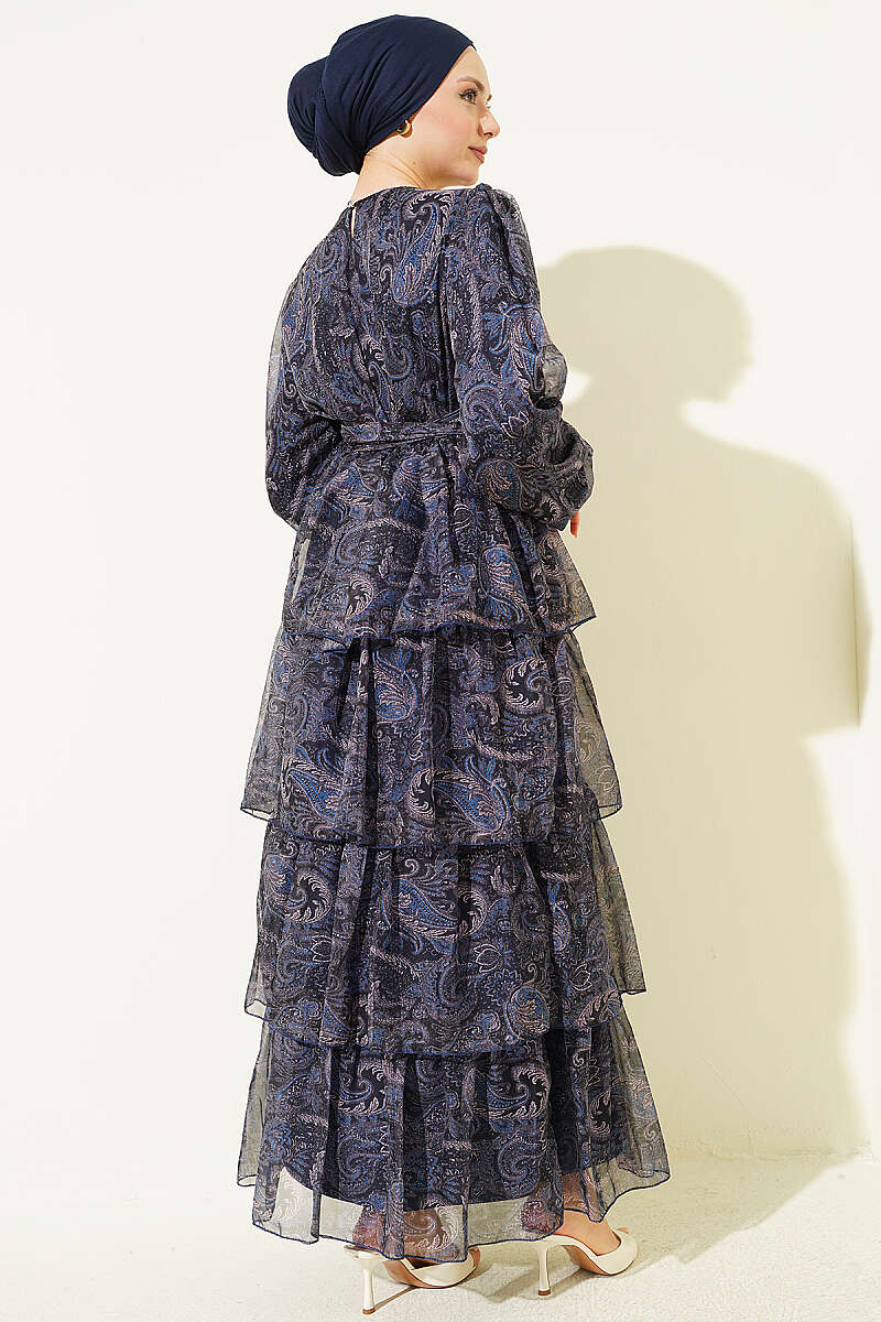 Paisley Desen Kat Kat Şifon Elbise Lacivert