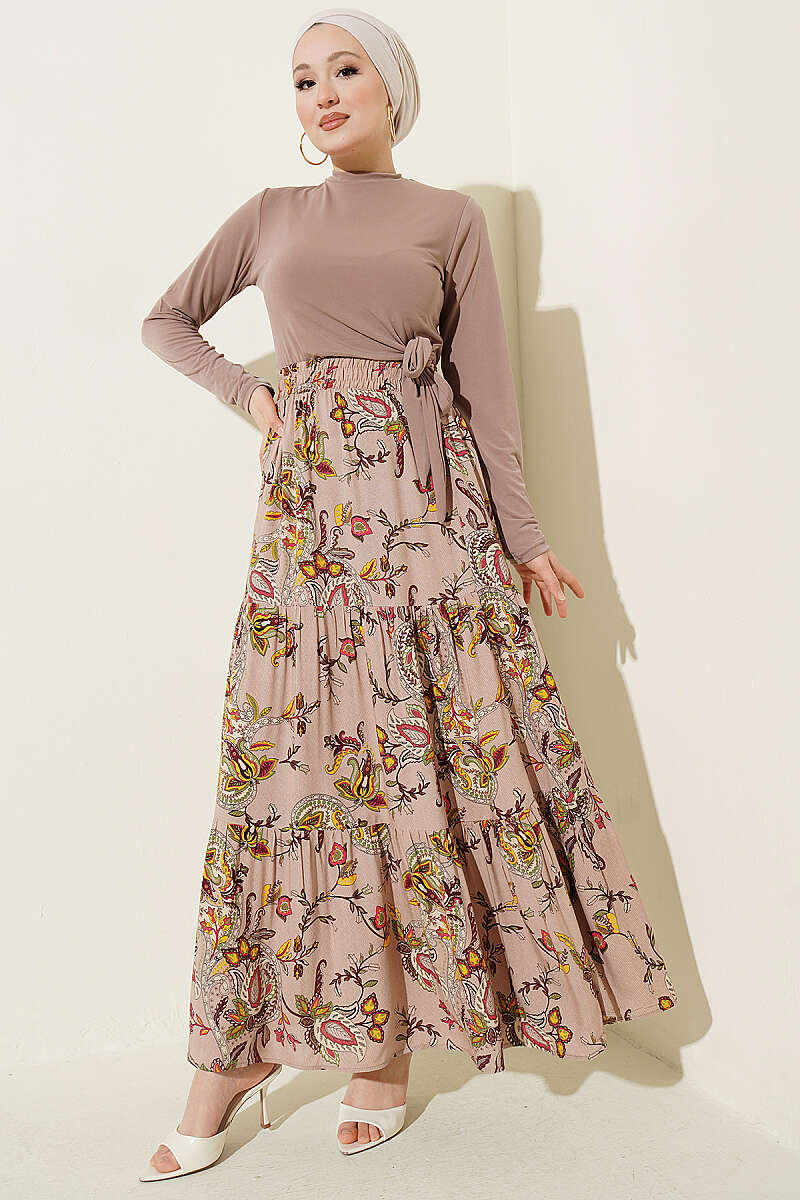 Paisley Desen Katlı Viskon Etek Bej