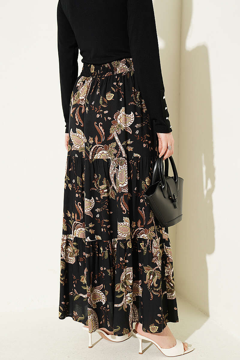Bohem stilin vazgeçilmez bir parçası olan bu viskon etek, geleneksel paisley motiflerini katlı tasarımıyla birleştirerek enerjik bir görünüm sunar. Doğal viskon liflerinden üretilen kumaşı, nefes alabilen yapısıyla gün boyu serin ve konforlu bir kullanım vadeder. Belindeki esnek lastik detayı sayesinde vücuda mükemmel uyum sağlarken, aşağı doğru genişleyen dökümlü kesimi her adımda zarif bir akıcılık oluşturur.