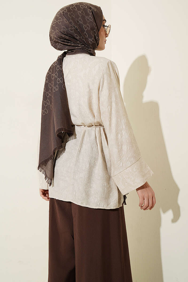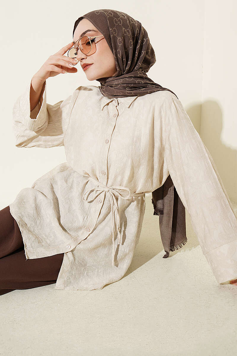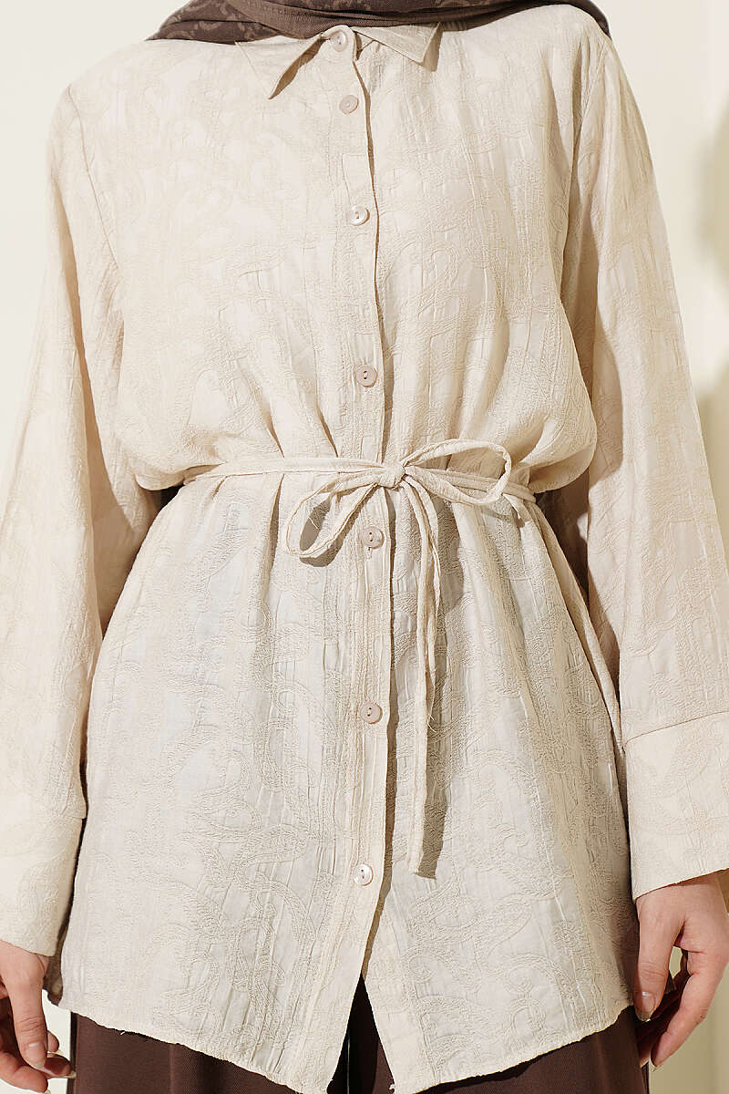 Paisley Desenli İp Kuşaklı Gömlek Bej