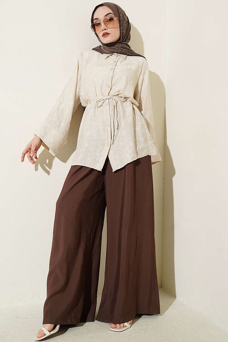 Bu gömlek, kumaşın kendi dokusuna işlenmiş zarif paisley desenleri ile klasik gömlek tasarımına sofistike ve otantik bir hava katar. Bel kısmında yer alan ip kuşak detayı, vücut formunu zarifçe vurgularken kombine hareketli ve modern bir silüet kazandırır. Dökümlü kumaşı ve rahat kesimi sayesinde gün boyu konfor sunan bu parça, hem günlük hayatta hem de şık ortamlarda zahmetsizce kullanılabilir. Doğal dokusu ve ikonik desenleriyle, gardırobunuza hem geleneksel hem de yenilikçi bir dokunuş eklemek için ideal bir seçenektir.