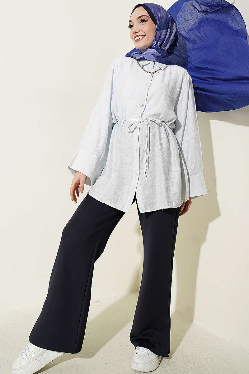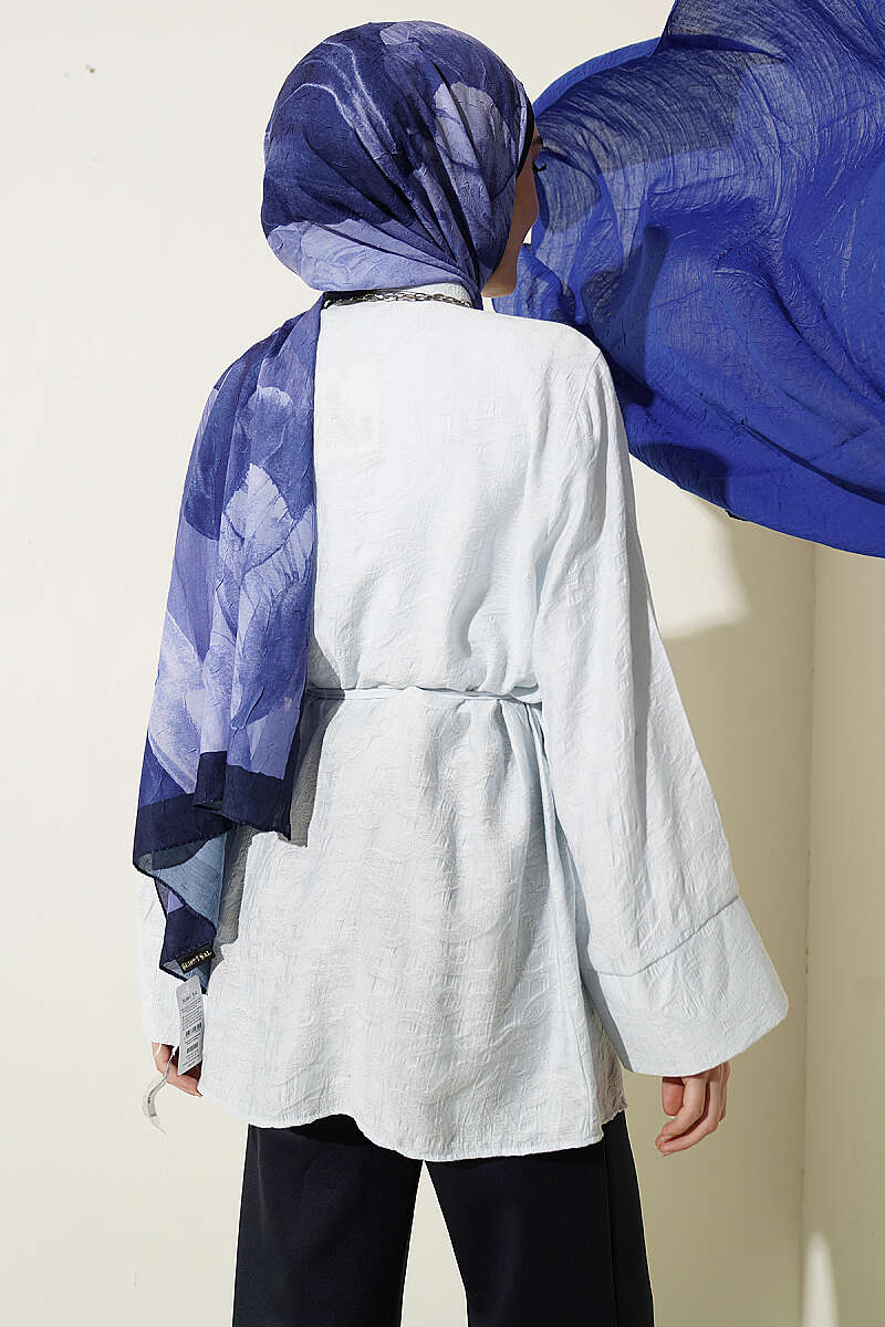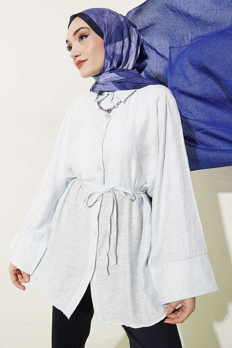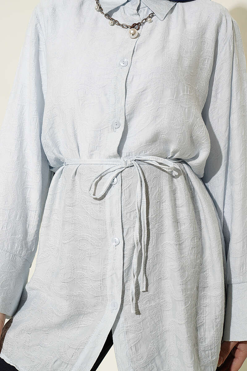 Paisley Desenli İp Kuşaklı Gömlek Buz Mavisi