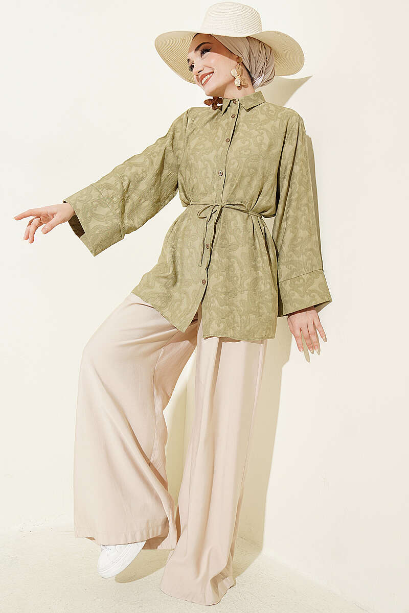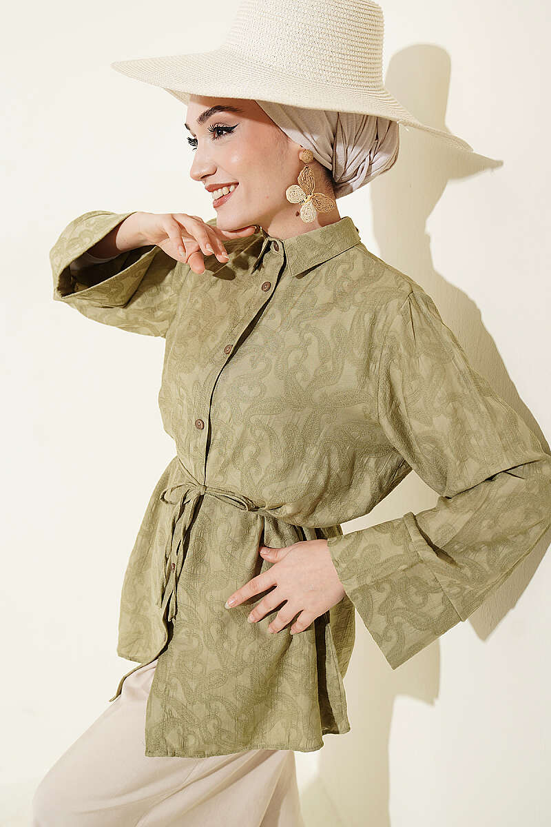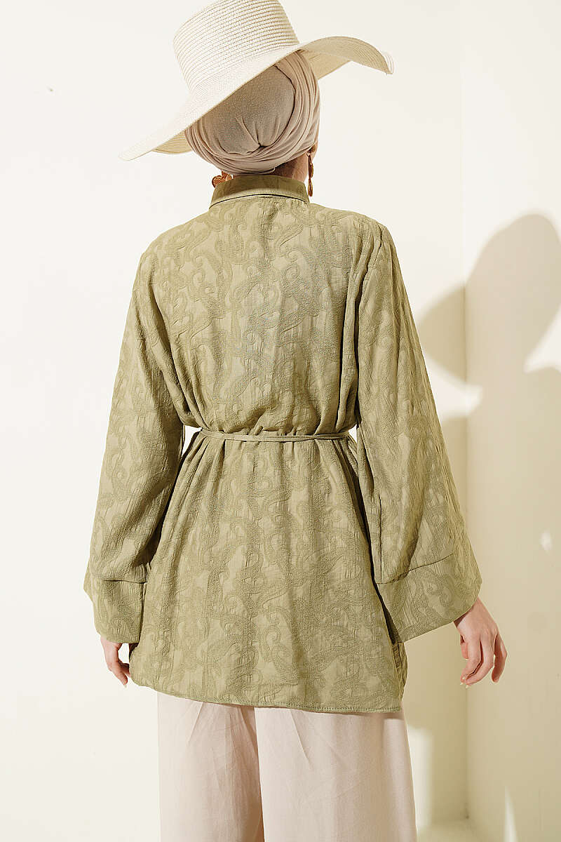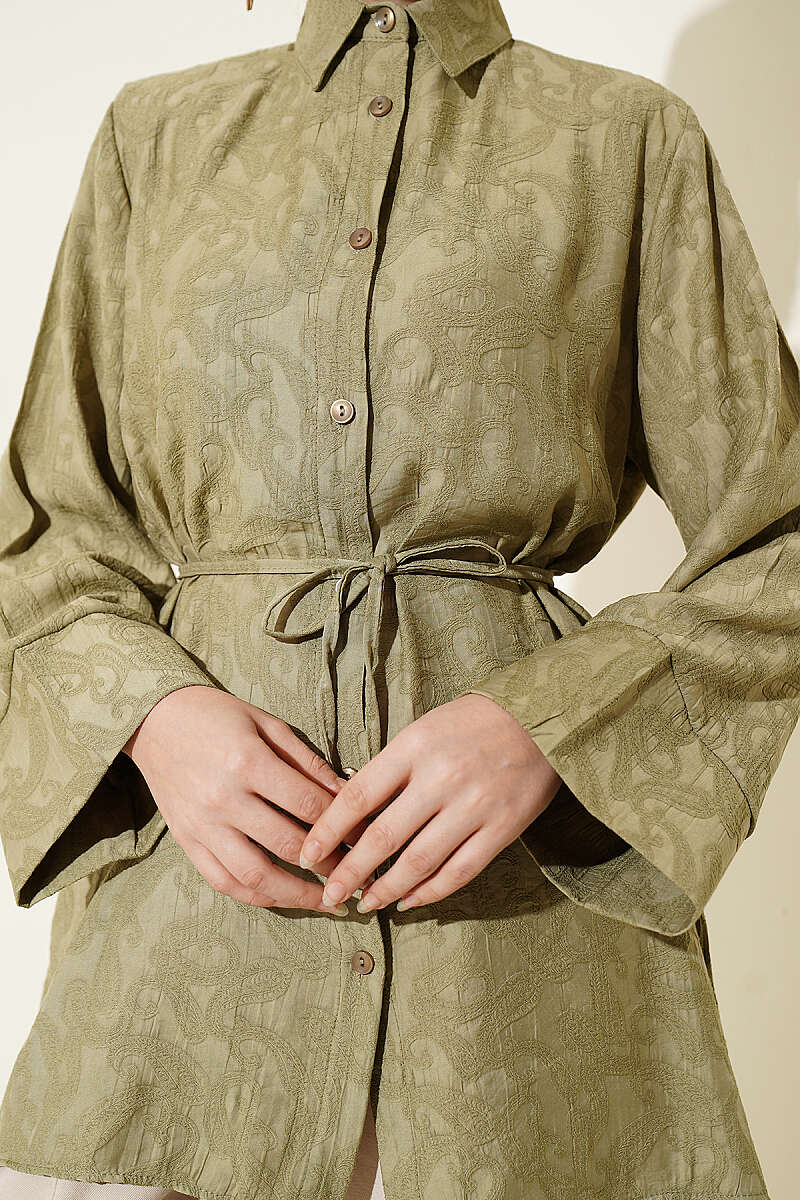 Paisley Desenli İp Kuşaklı Gömlek Haki