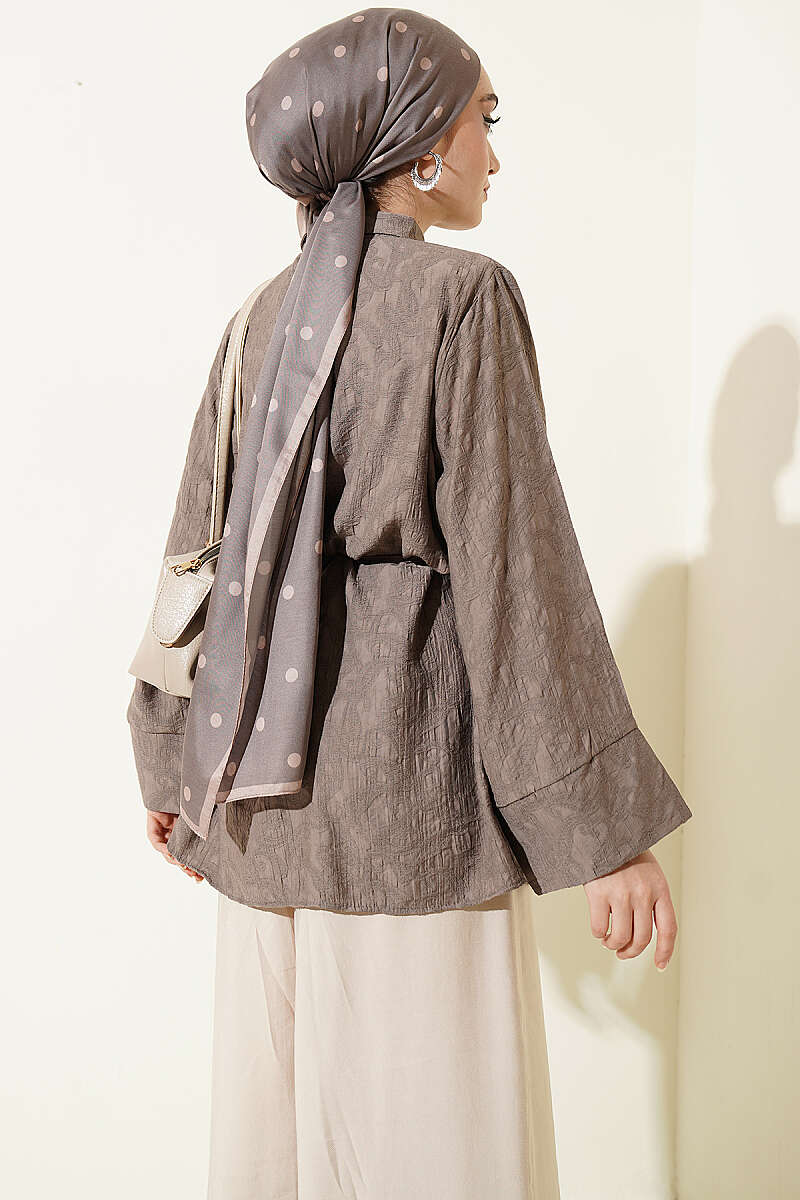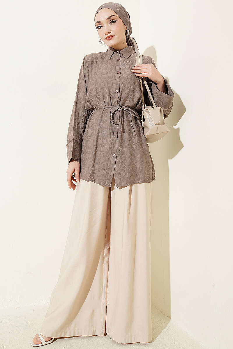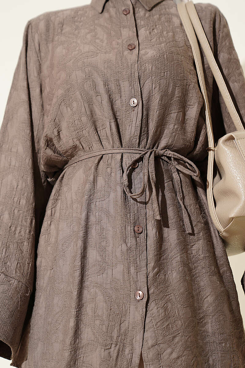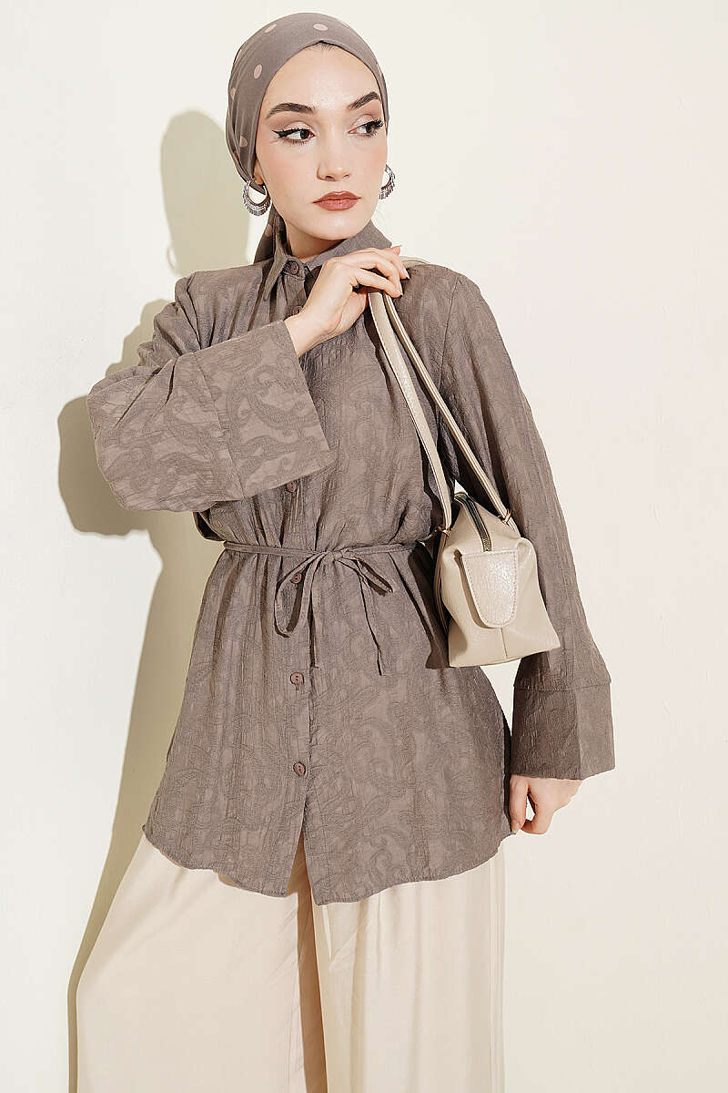 Paisley Desenli İp Kuşaklı Gömlek Koyu Vizon