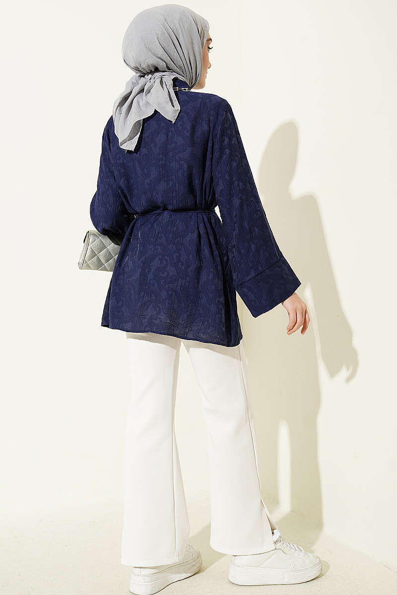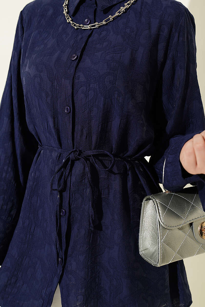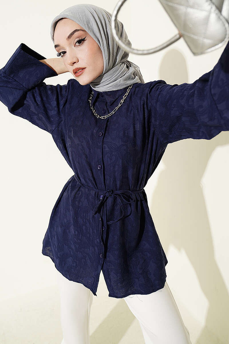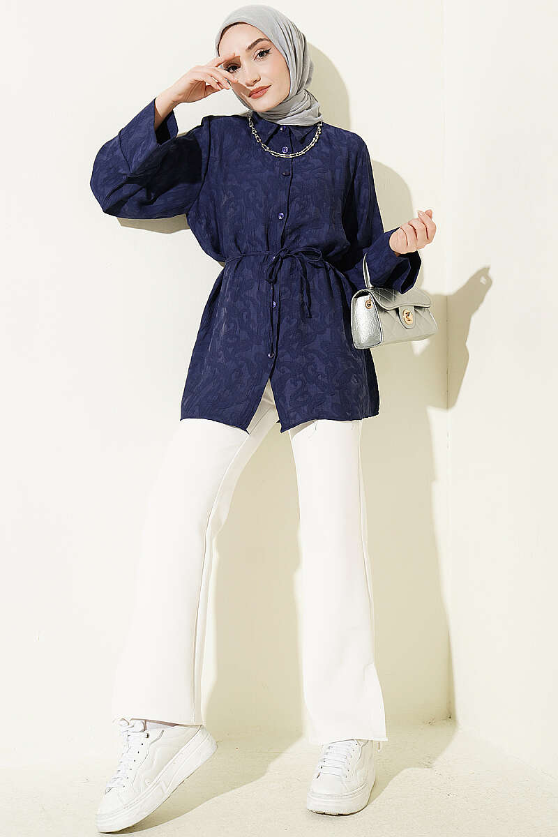 Bu gömlek, kumaşın kendi dokusuna işlenmiş zarif paisley desenleri ile klasik gömlek tasarımına sofistike ve otantik bir hava katar. Bel kısmında yer alan ip kuşak detayı, vücut formunu zarifçe vurgularken kombine hareketli ve modern bir silüet kazandırır. Dökümlü kumaşı ve rahat kesimi sayesinde gün boyu konfor sunan bu parça, hem günlük hayatta hem de şık ortamlarda zahmetsizce kullanılabilir. Doğal dokusu ve ikonik desenleriyle, gardırobunuza hem geleneksel hem de yenilikçi bir dokunuş eklemek için ideal bir seçenektir.