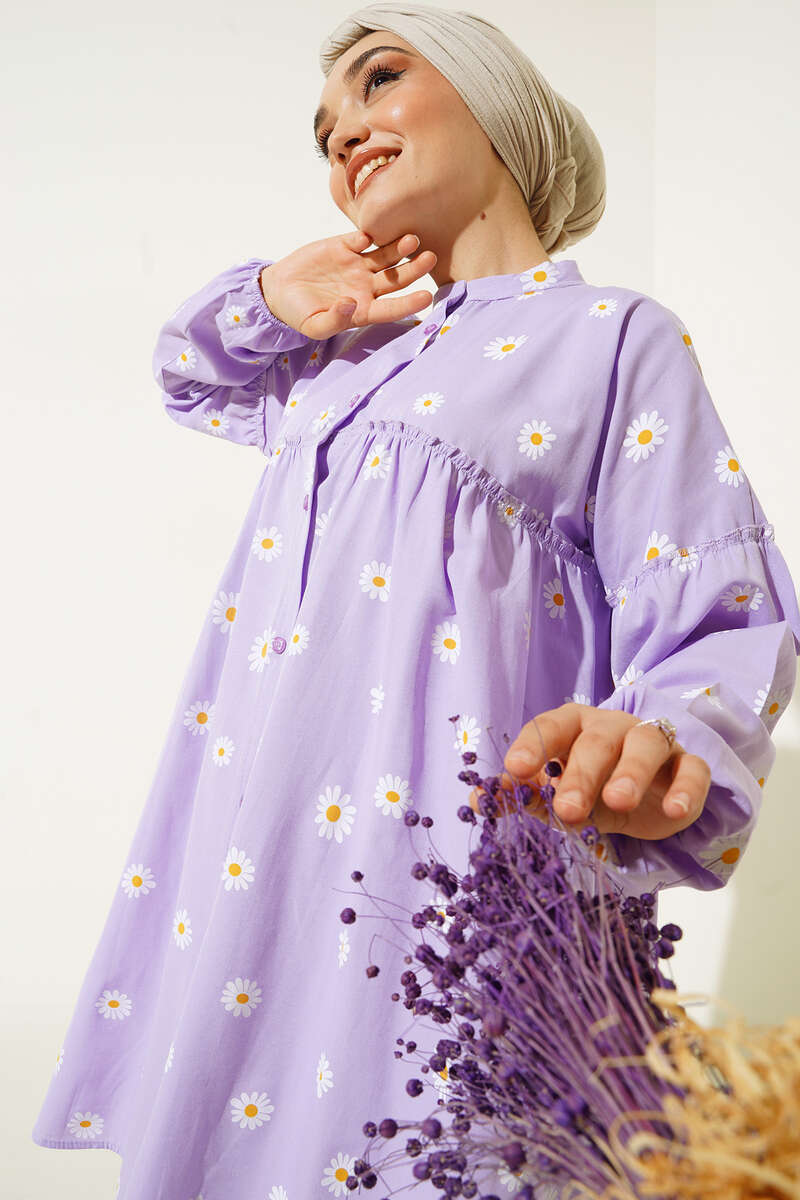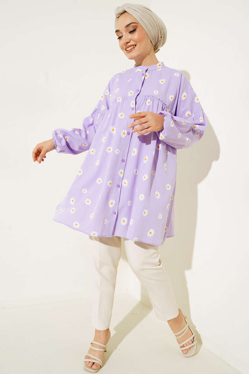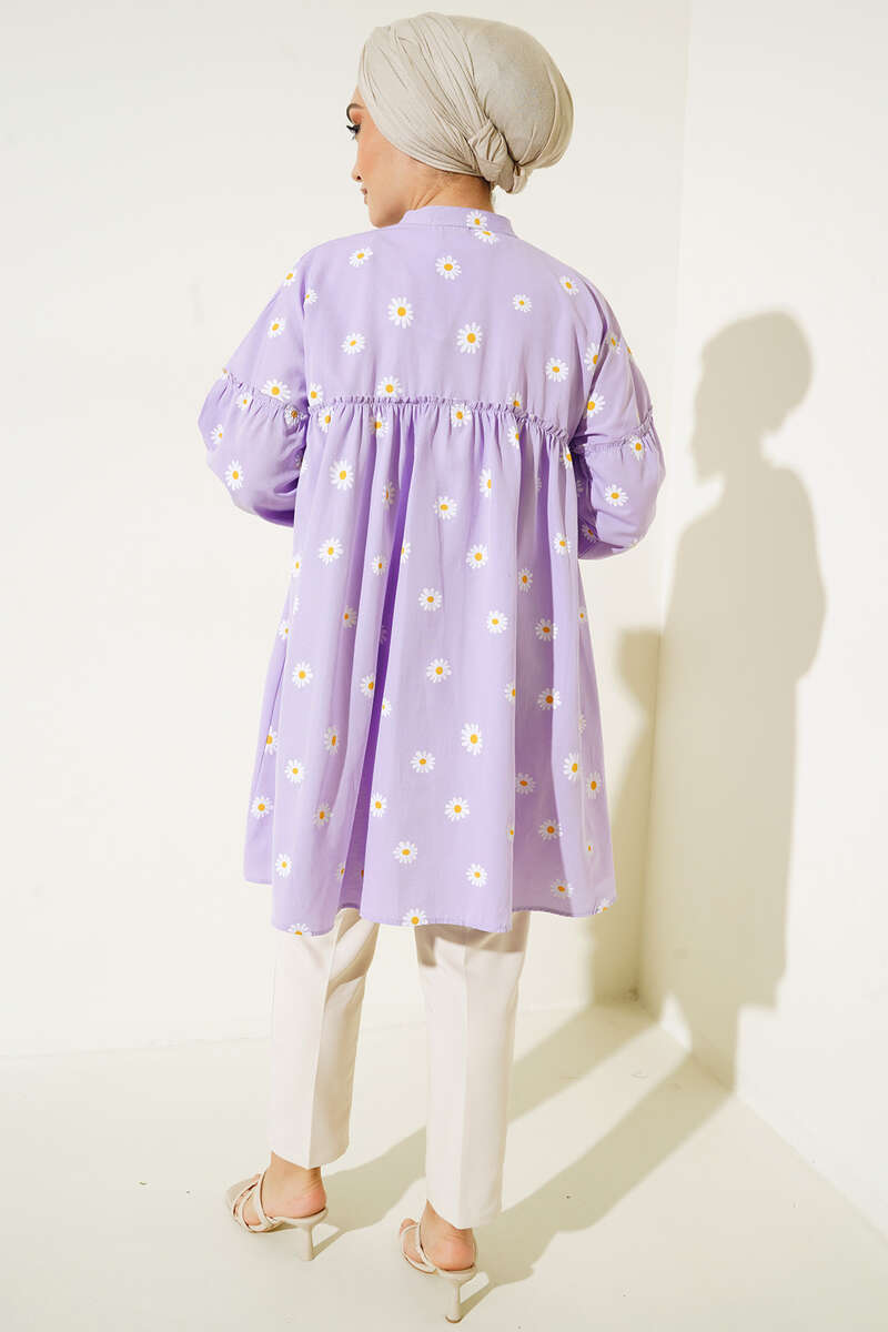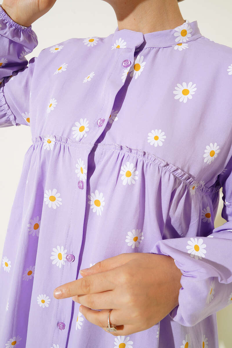 Yeni sezon tuniğimiz üzerinde bulunan büzgü detaylarıyla dikkat çekmektedir. Papatya desenleriyle tarzını ortaya kayan tuniğimizin bilekleri lastiklidir. Tuniğimizin ön kısmında düğmeler bulunmaktadır.