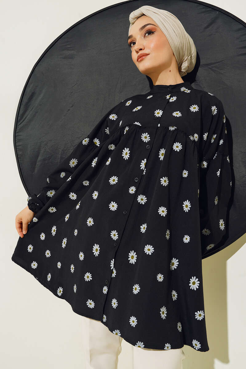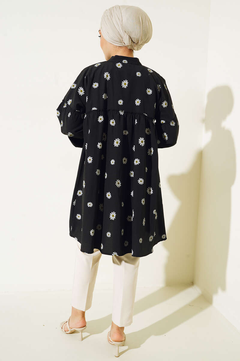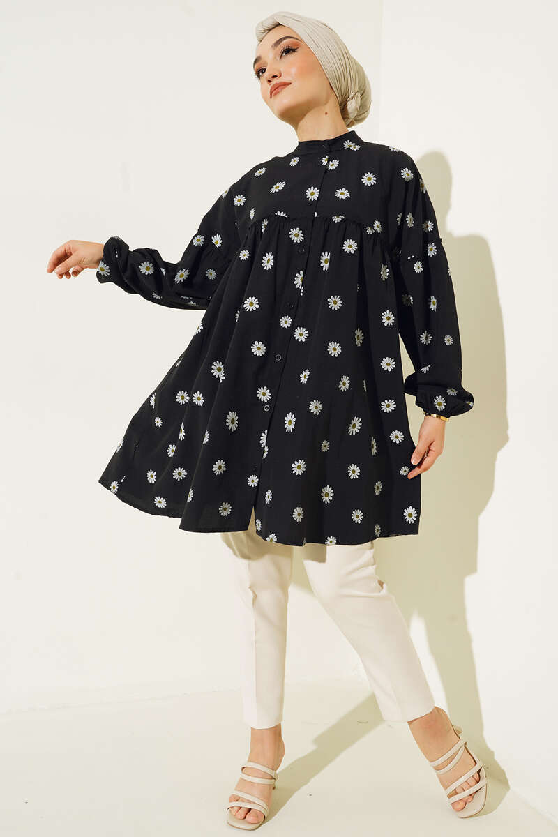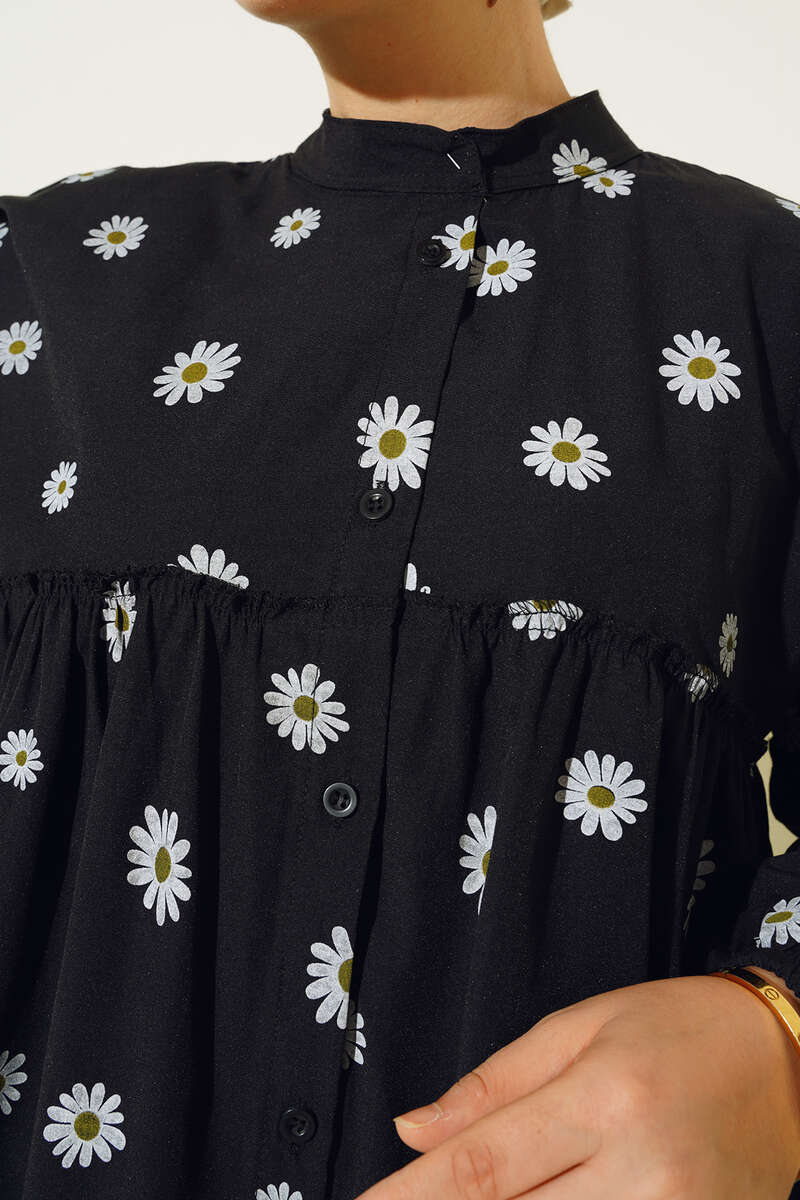 Papatya Desenli Büzgü Detaylı Düğmeli Tunik Siyah