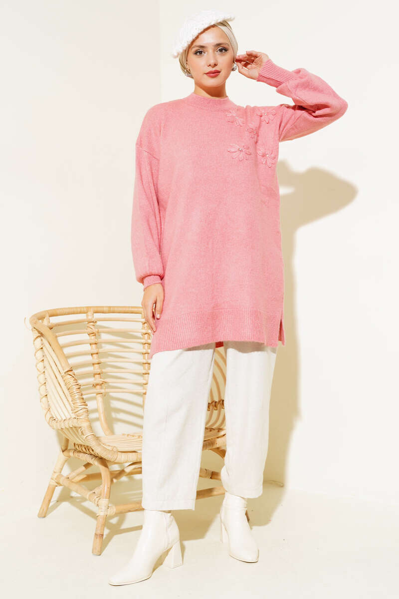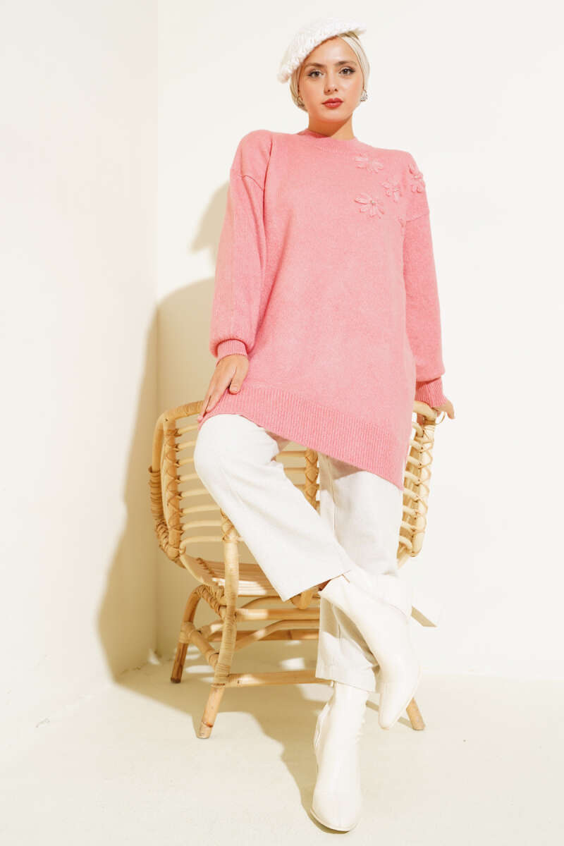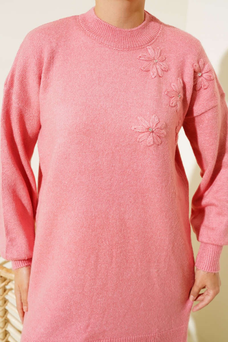 Papatya Detaylı Yumoş Triko Tunik Gül Kurusu