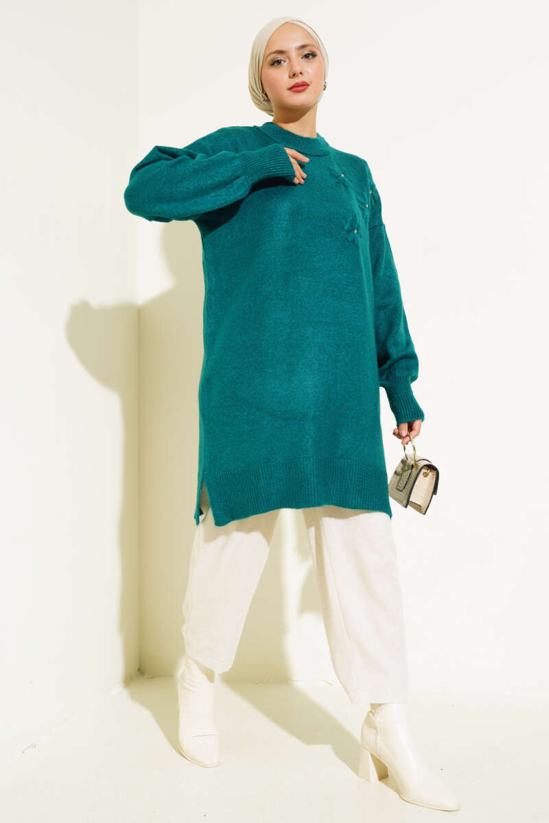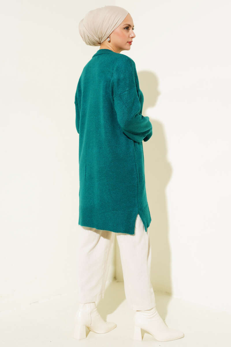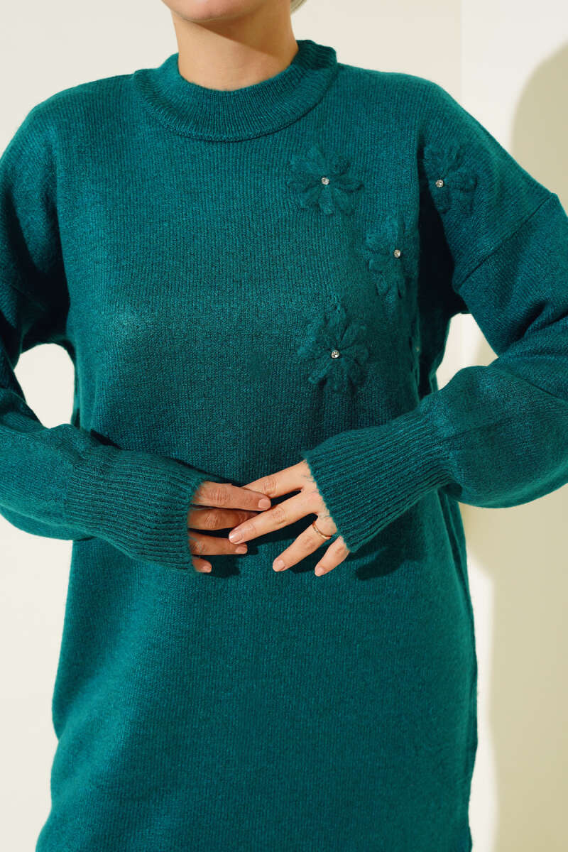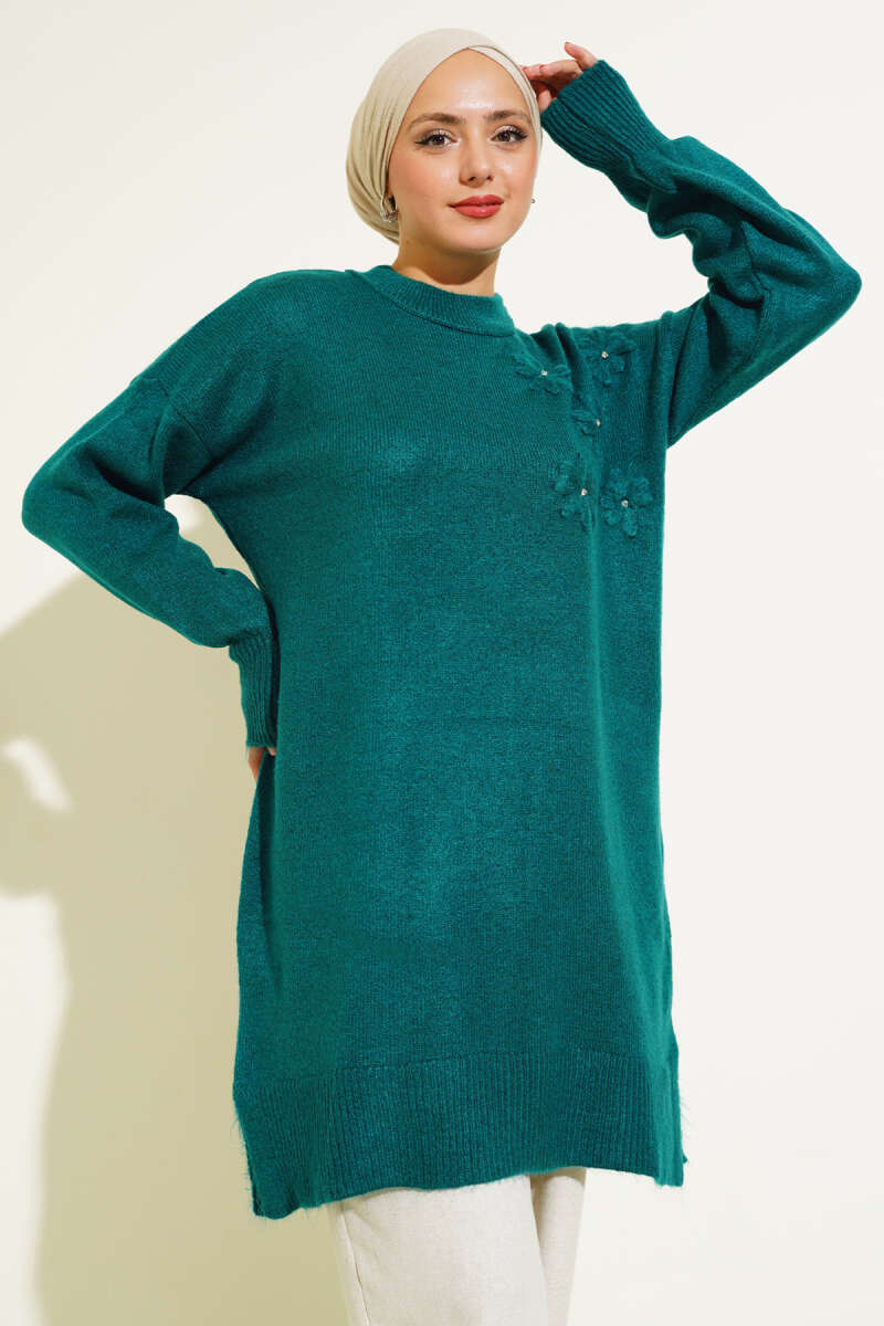 Çizgi Baklava Desen Triko Tunik Zümrüt