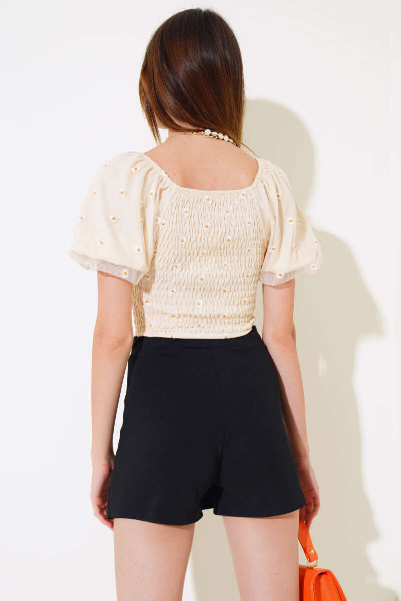 Papatya Nakışlı Kayık Yaka Bluz Bej