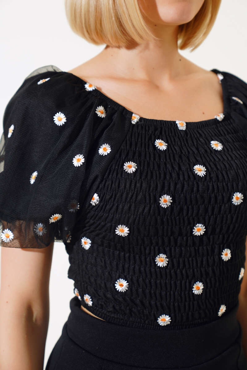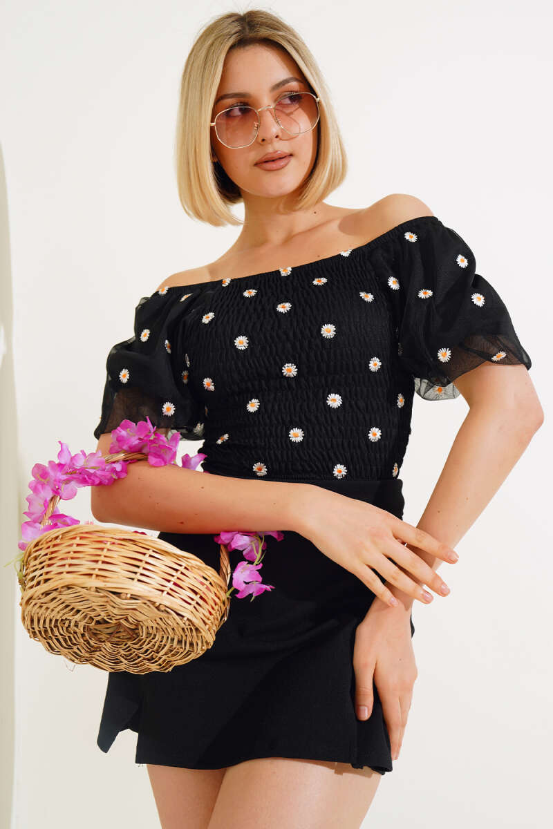 Papatya Nakışlı Kayık Yaka Bluz Siyah