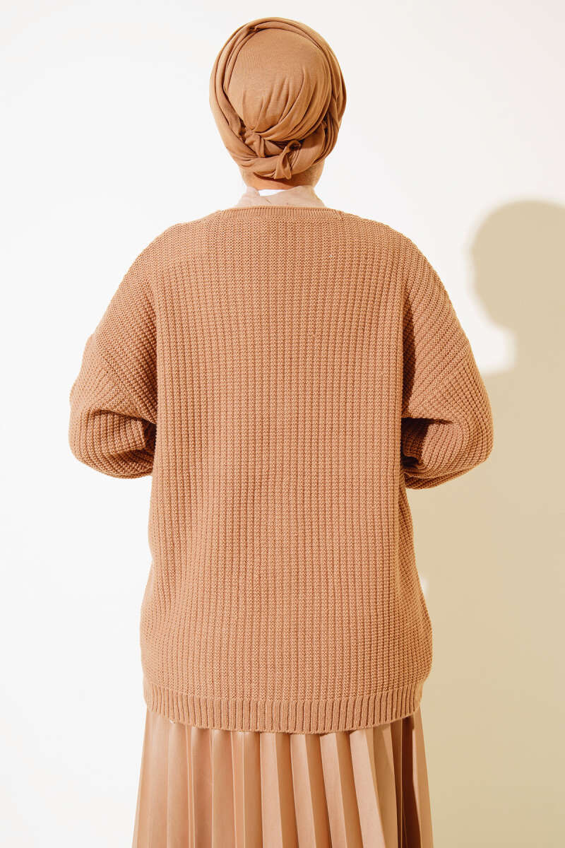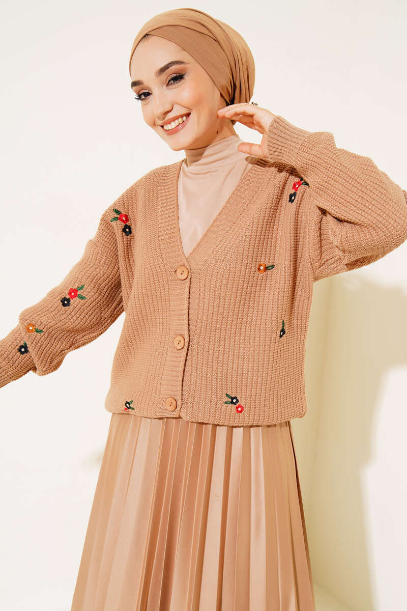 Çiçek Nakışlı Düğmeli Merserize Hırka Vizon