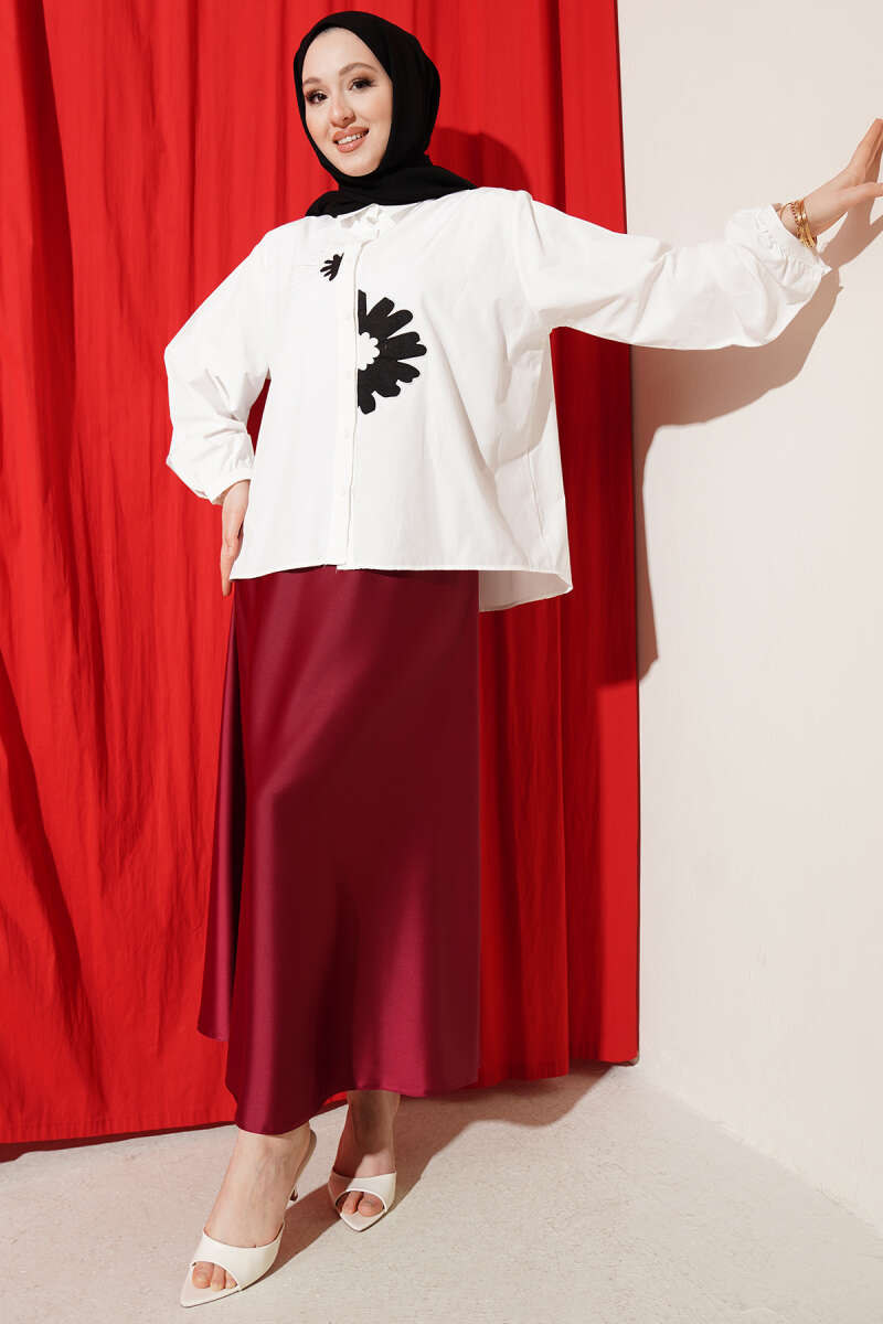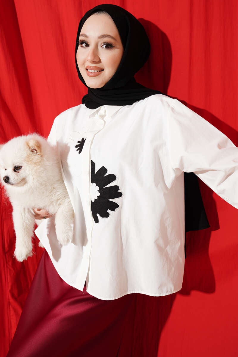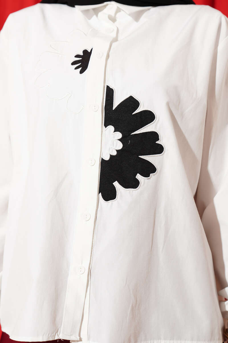 Papatya Nakışlı Oversize Gömlek Beyaz