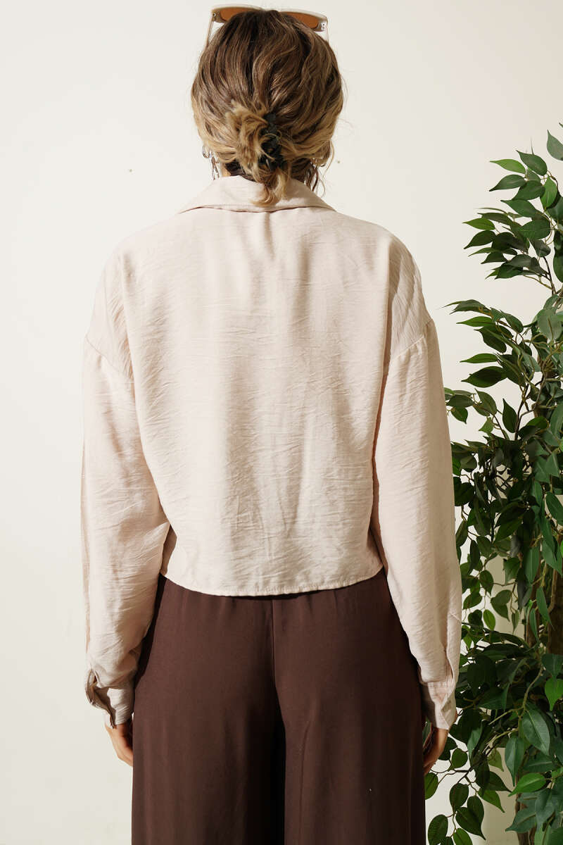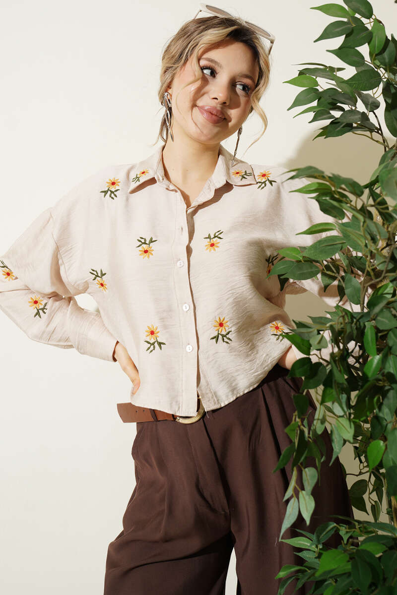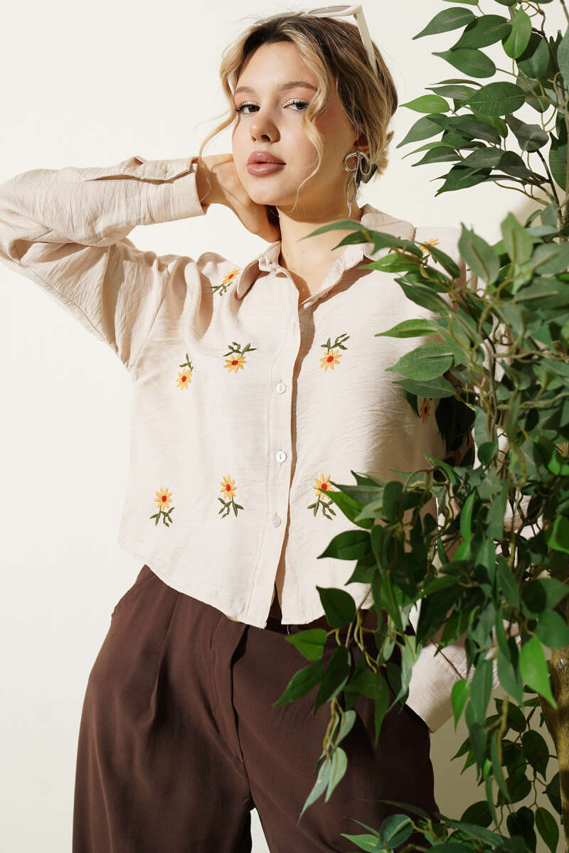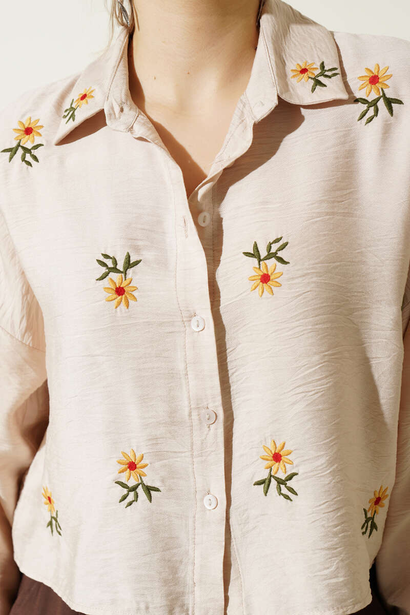 Papatya Nakışlı Uzun Kol Crop Gömlek Bej