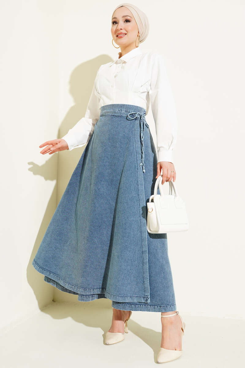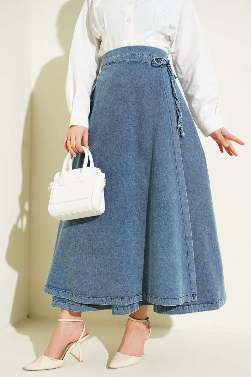 Parça Detaylı Bağlamalı Kot Etek Açık Mavi