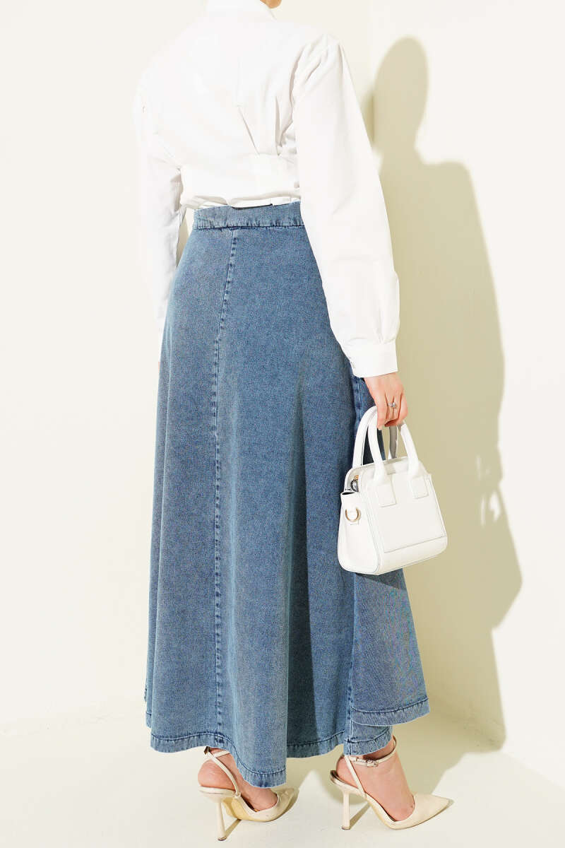 Parça Detaylı Bağlamalı Kot Etek Mavi