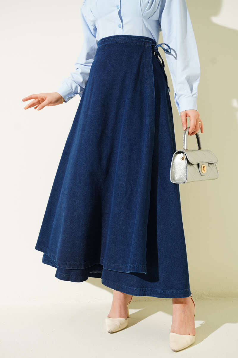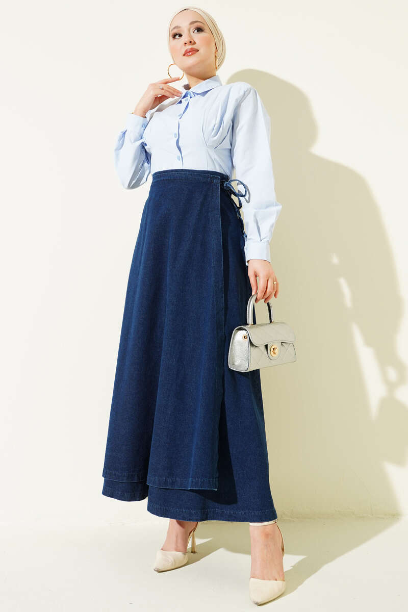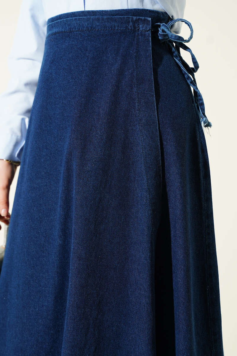 Parça Detaylı Bağlamalı Kot Etek Mavi