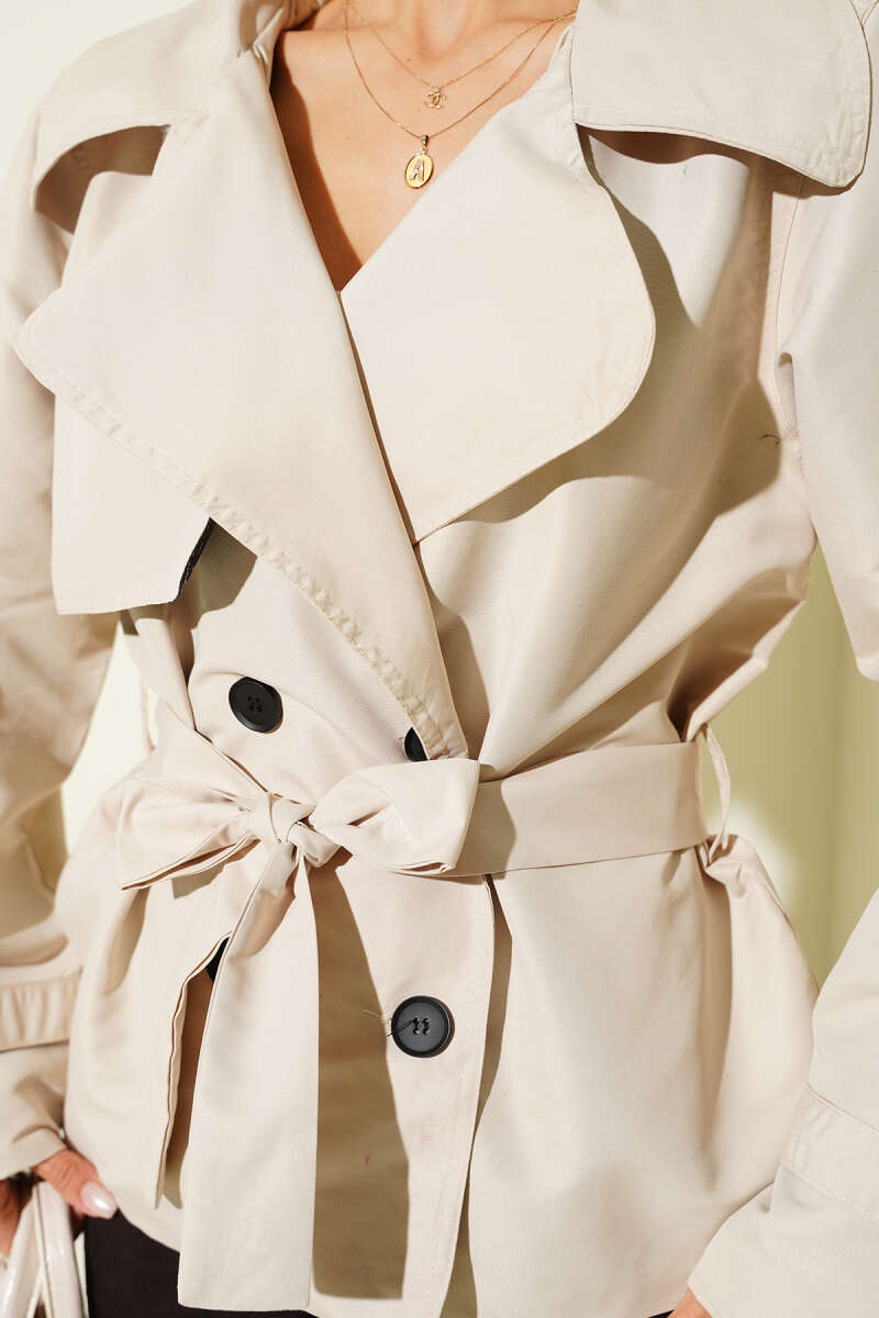Parça Detaylı Düğmeli Kısa Trençkot Bej