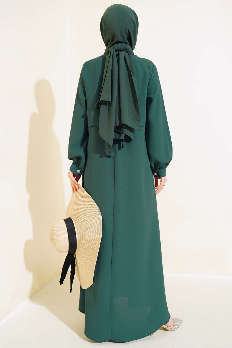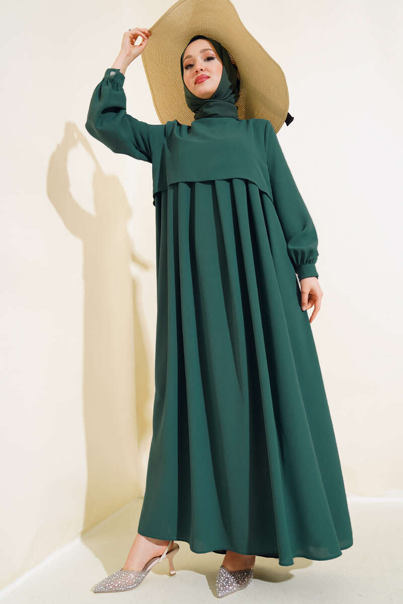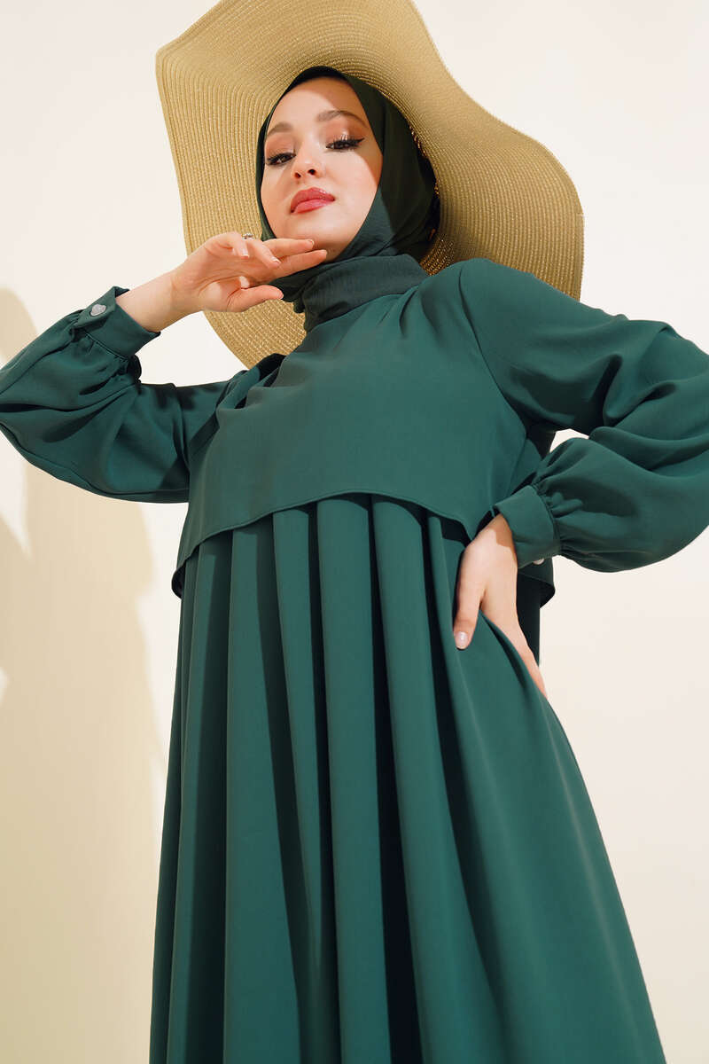 Yeni sezon elbise modelimiz sizlerle beraber. Elbisemiz önü ve arkası parça detaylıdır. Kol bilekleri manşetli ve düğmelidir. Önü pilelidir. Sırtı fermuarlıdır. Astarsızdır. Elbisemiz renk seçenekleriyle özel günleriniz için tasarlanmıştır.