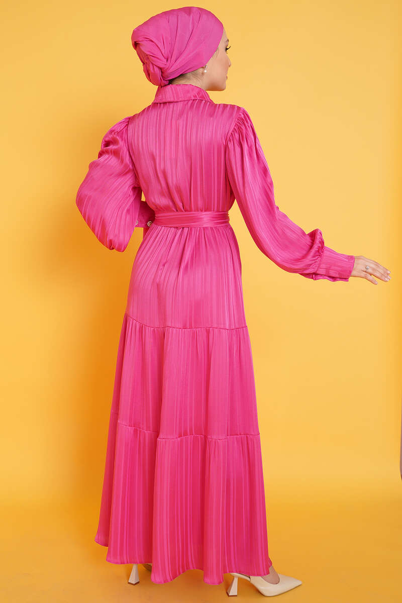 Yeni sezon elbisemiz dikkat çeken tasarımıyla sizler için geldi. Elbisemizin bilekleri ve yakasındaki düğme pırıltılı taşlardandır. Önü yarıya kadar düğmelidir. Parlak çizgi desenlidir. Kuşağı bulunmaktadır. Balon koldur. Kat kat modeldir. Her ortamda rahatlıkla giyebilirsiniz. Farklı renk seçenekleri mevcuttur.