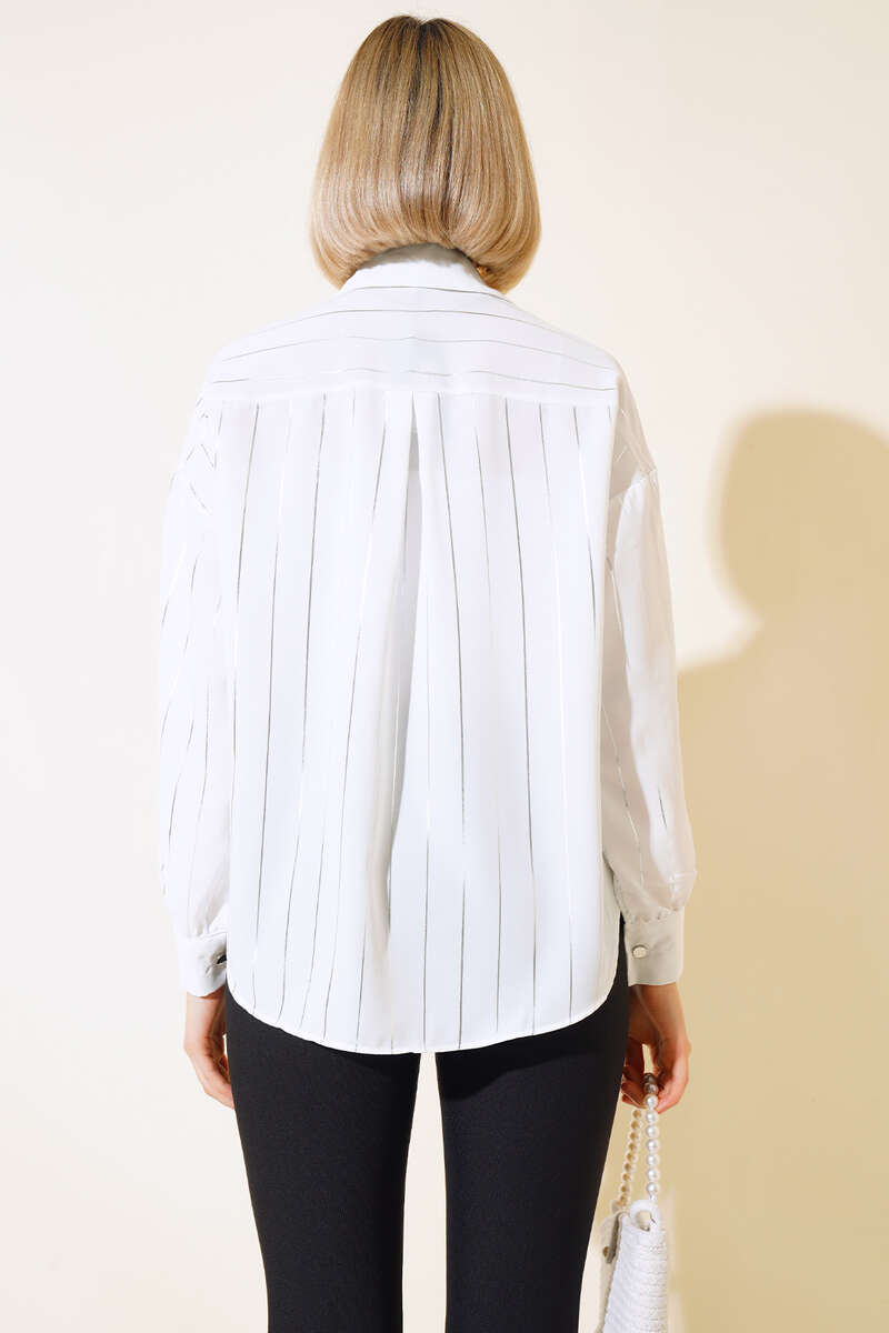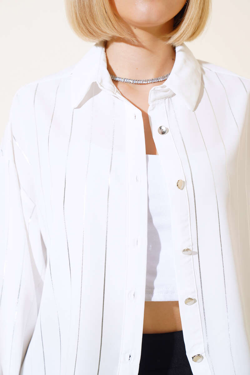 Parlak Çizgili Metal Düğmeli Gömlek Beyaz