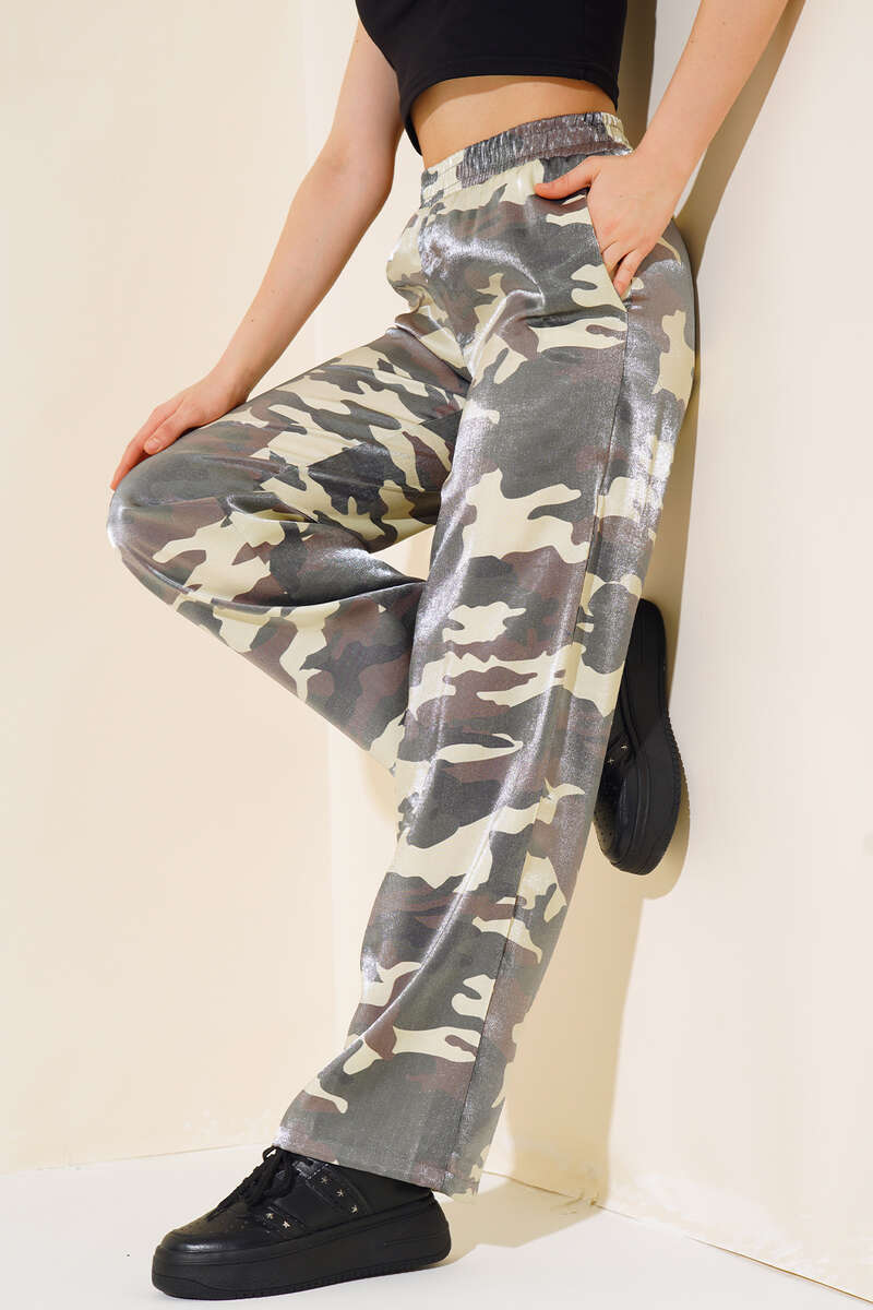 Yeni sezon pantolon modelimiz sizlerle beraber. Parlak kumaş olan pantolonumuzun beli lastiklidir. İki adet cebi olan pantolonumuzun desenleriyle hareketlilik kazanmıştır. Kombinlerinizin tamamlayıcı parçası olacak pantolonumuzun renkleri mevcuttur.