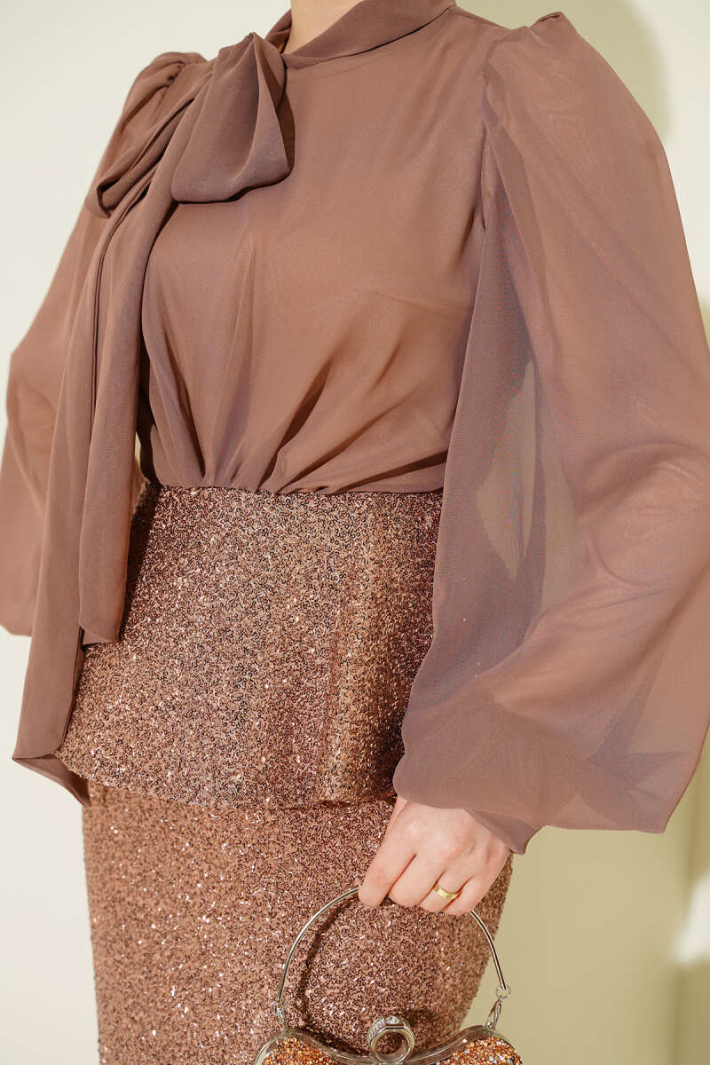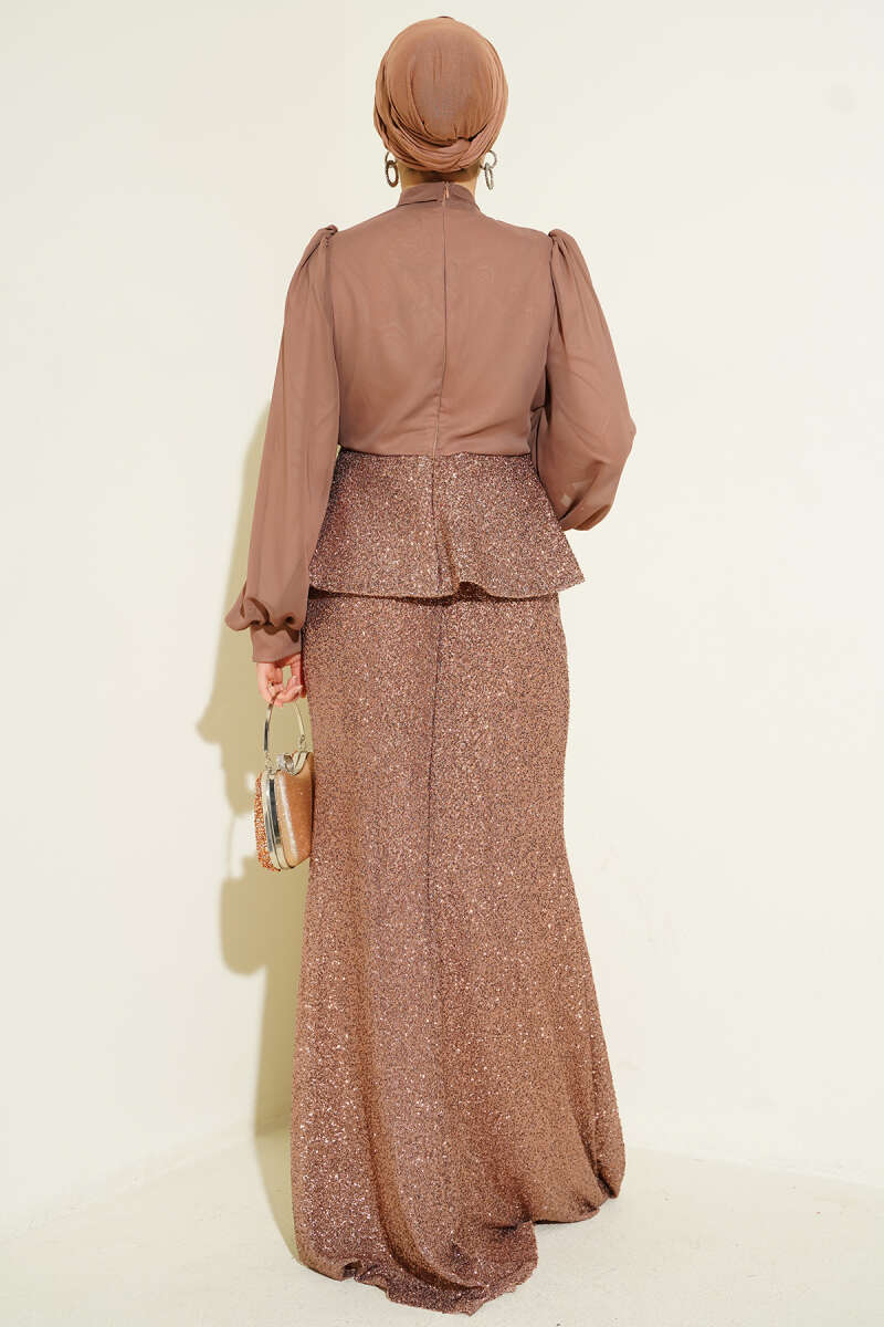 Parlak Pul Detaylı Abiye İkili Takım Kahve
