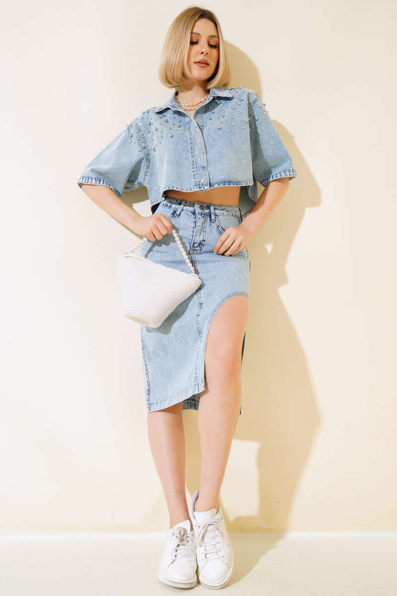 Yeni sezon ceket modelimiz sizlerle beraber. Ceketimizin omuzu ve önü parlak taşlarla süslenmiştir. Düşük omuzludur. Önü boydan çıtçıt düğmelidir. Salaş modeldir. Hem şık hem sportif kombinlerinizin favori parçası olacaktır.