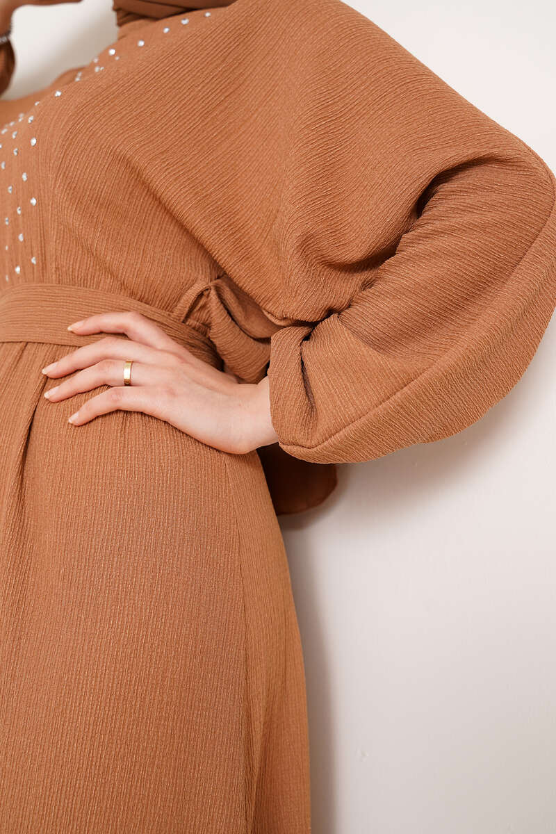 Parlak Taşlı Bürümcük Elbise Camel