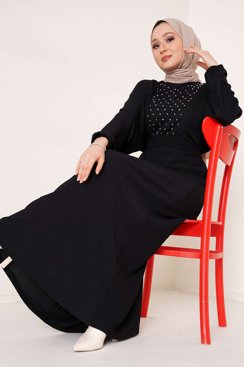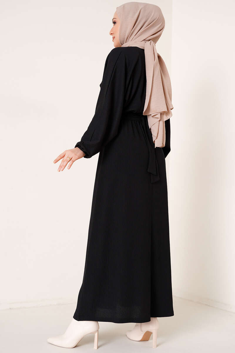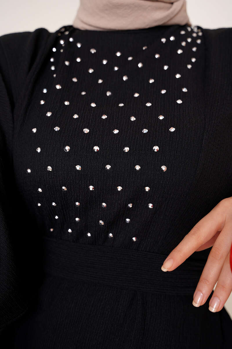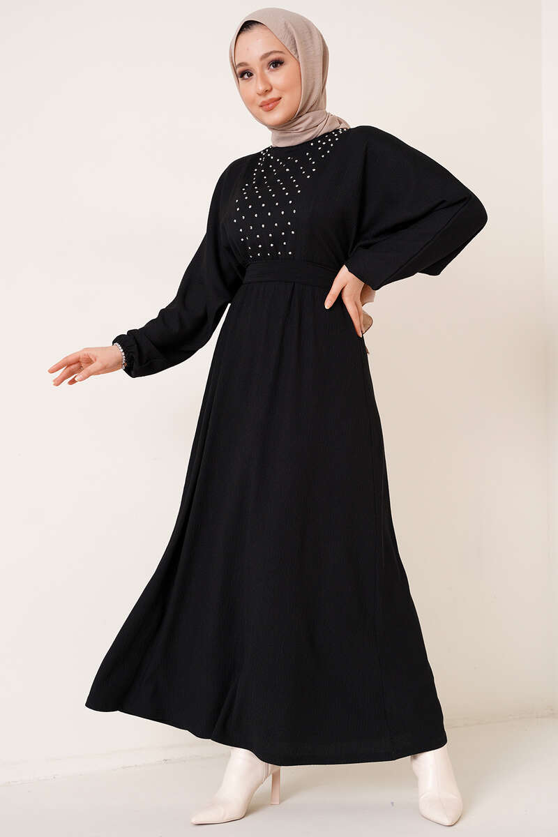 Yeni sezon elbisemizin önü parlak taşlarla süslenmiştir. Yarasa kol elbisemiz oval yakadır. Bilekleri lastiklidir. Elbisemiz kuşaklı olup iki adet kemer köprüsüne sahiptir. Kuşağı kendi rengi ve kumaşındandır.