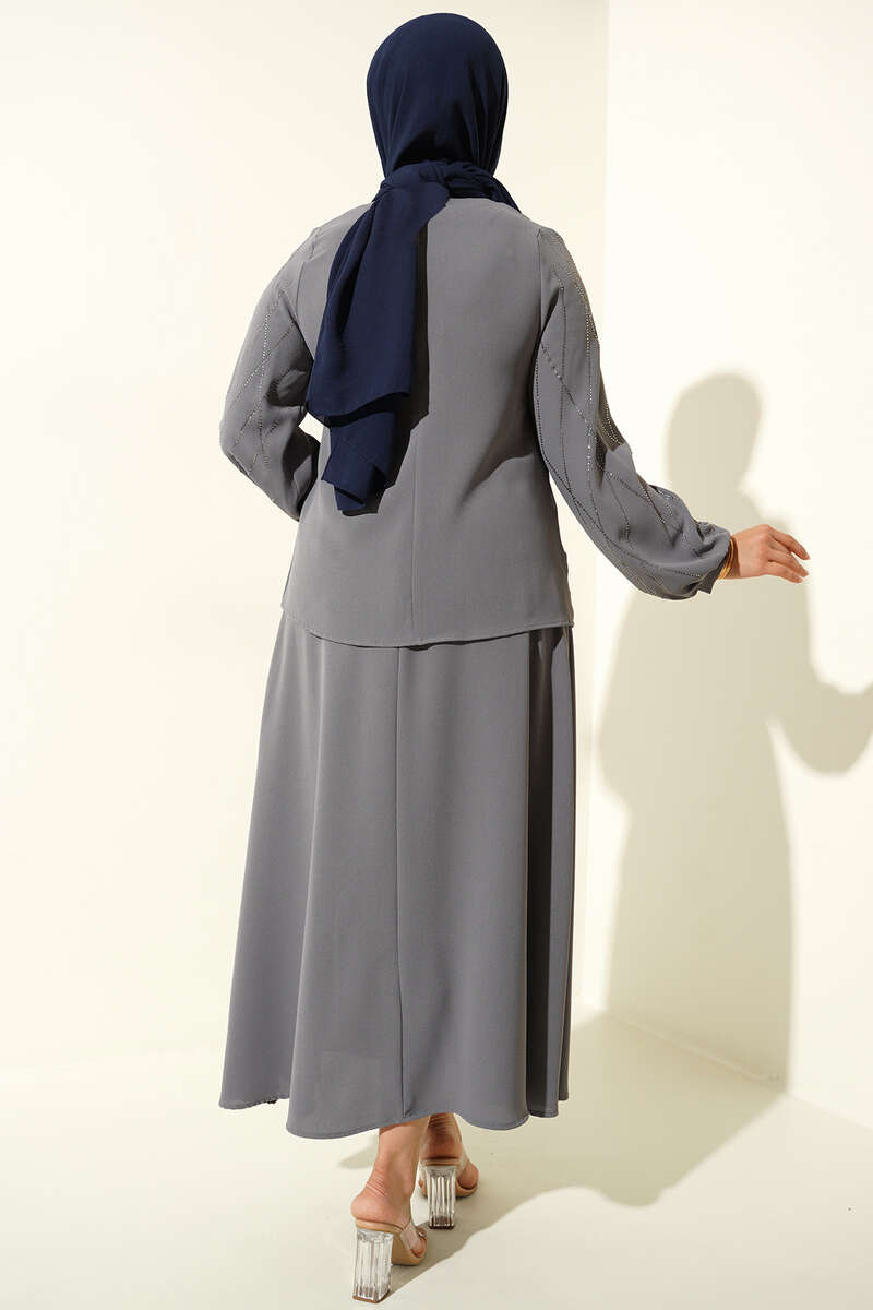 Yeni sezon etekli ikili takımımız harika tasarımıyla sizler için geldi. Tuniğimizin önünde ve kollarında parlak taşlı süslemeler bulunmaktadır. Sırtı fermuarlıdır. Eteğimizin yanları fermuarlıdır. Takımımızı her ortamda rahatlıkla giyebilirsiniz. Farklı renk seçenekleri mevcuttur.