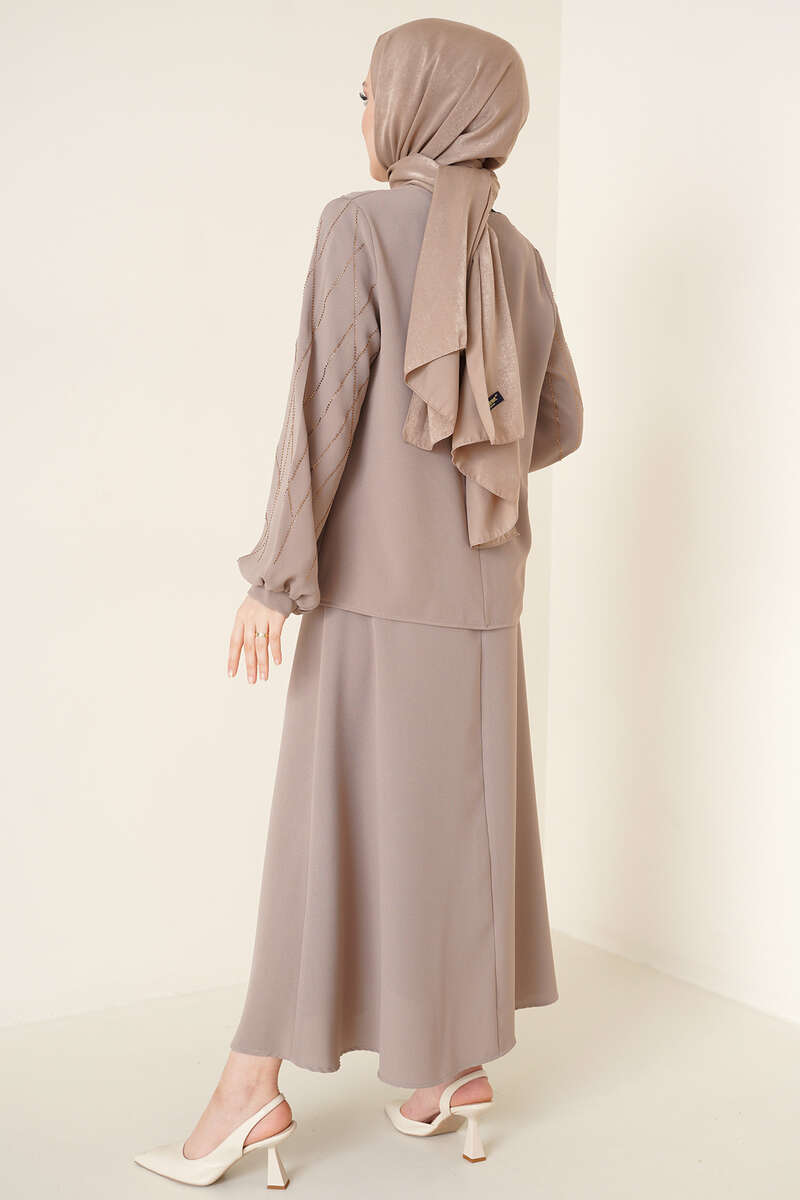 Yeni sezon etekli ikili takımımız harika tasarımıyla sizler için geldi. Tuniğimizin önünde ve kollarında parlak taşlı süslemeler bulunmaktadır. Sırtı fermuarlıdır. Eteğimizin yanları fermuarlıdır. Takımımızı her ortamda rahatlıkla giyebilirsiniz. Farklı renk seçenekleri mevcuttur.