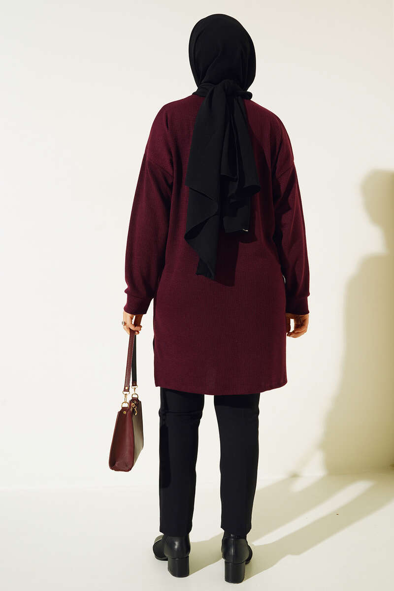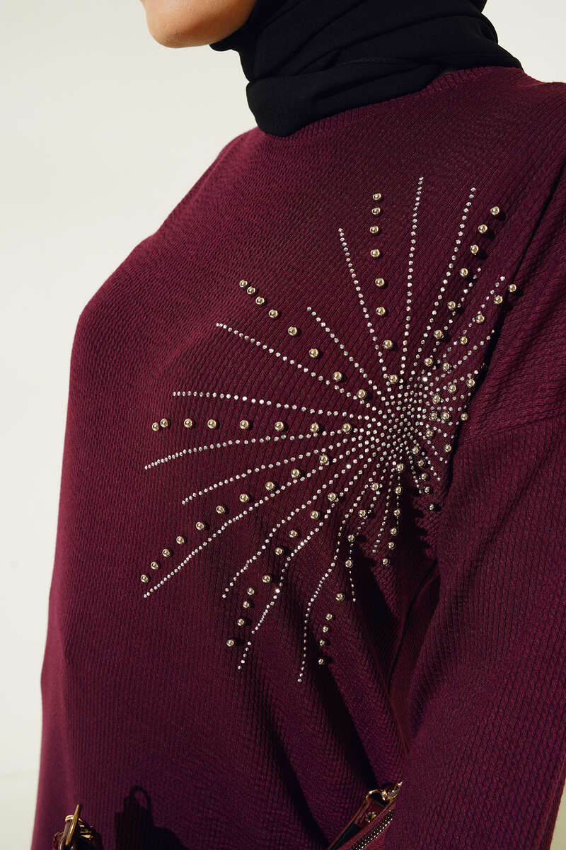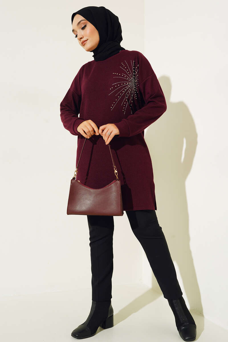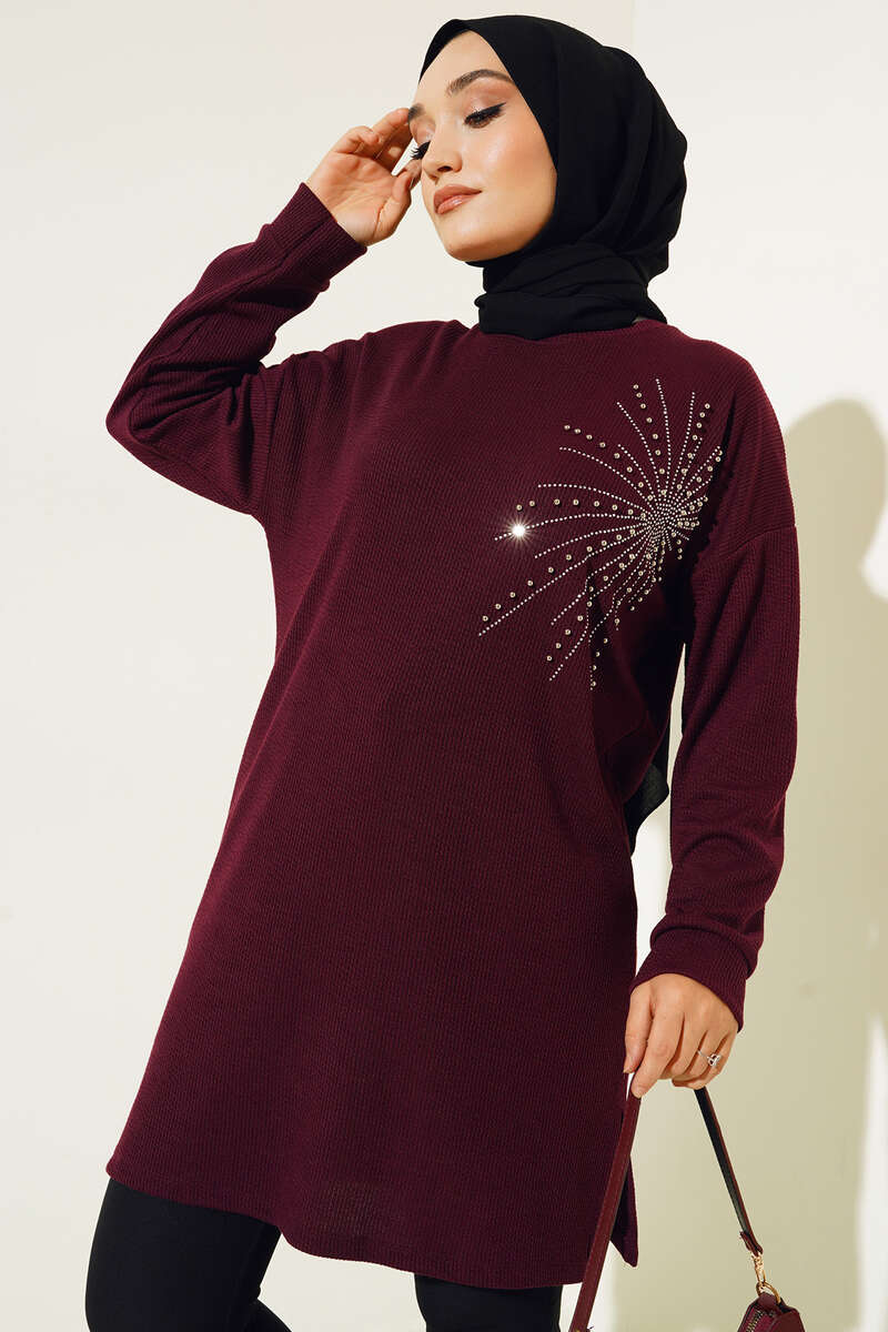 Parlak Taşlı İnce Fitilli Tunik Mürdüm