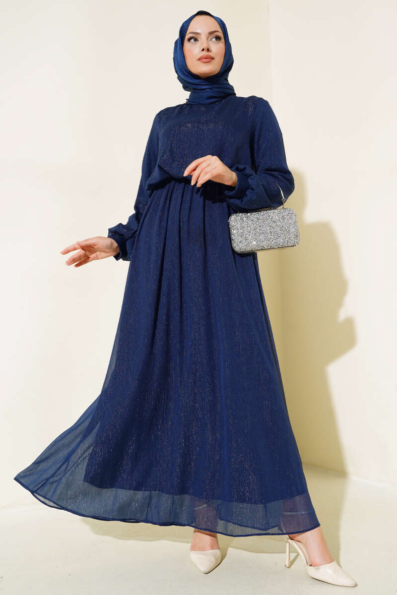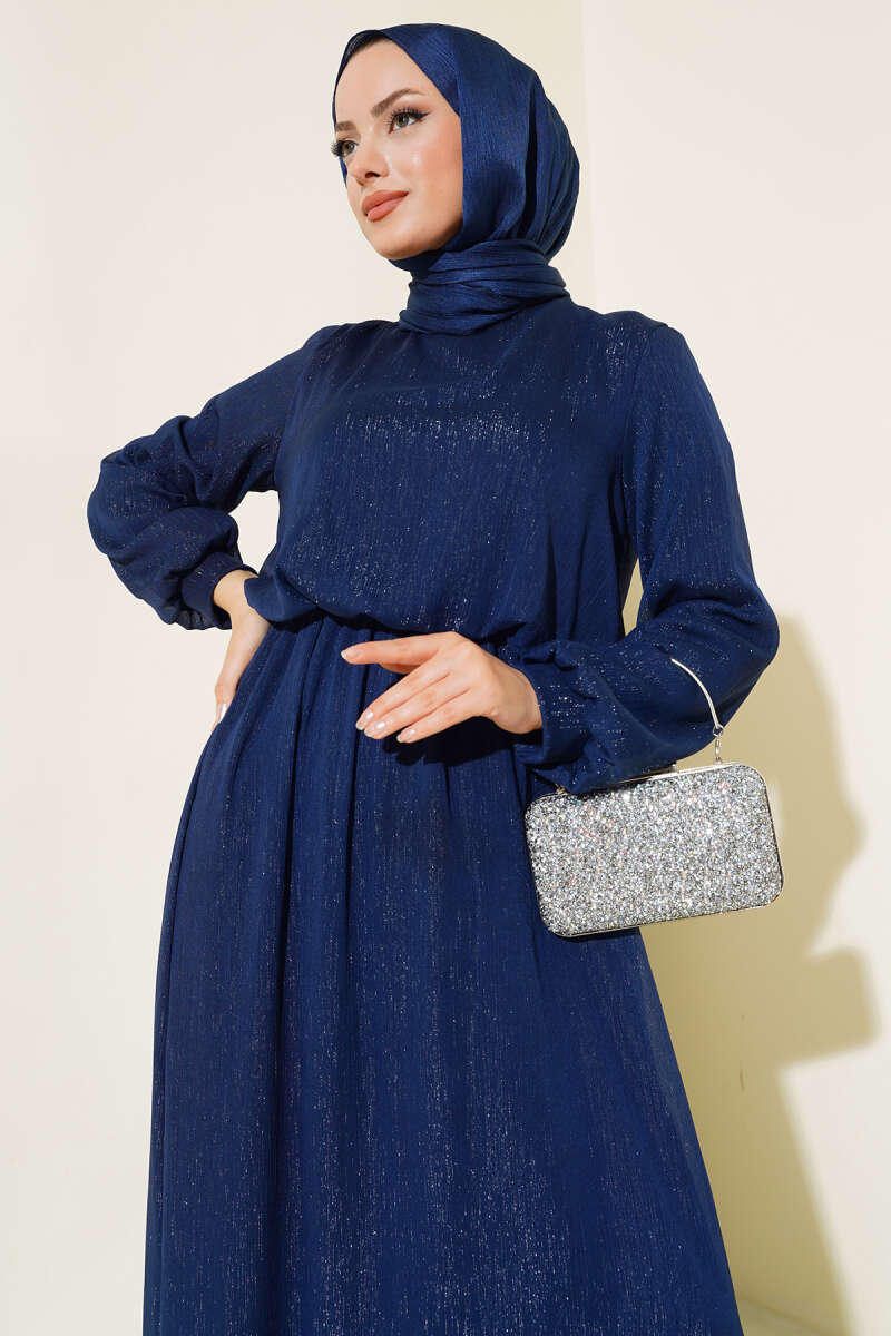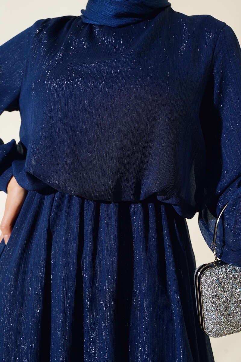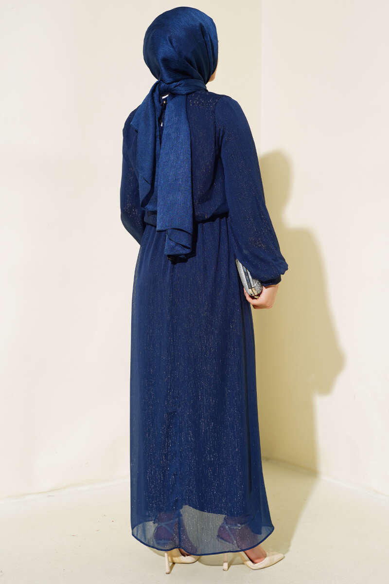 Düğmeli Tensel İnce Kemerli Elbise Lacivert