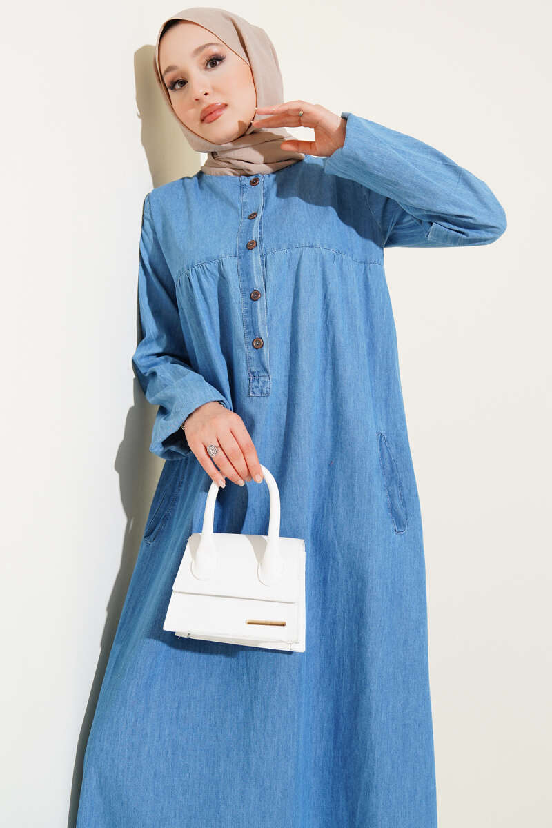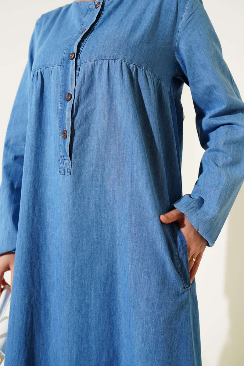 Patlı Beş Düğmeli Kot Mavisi Elbise