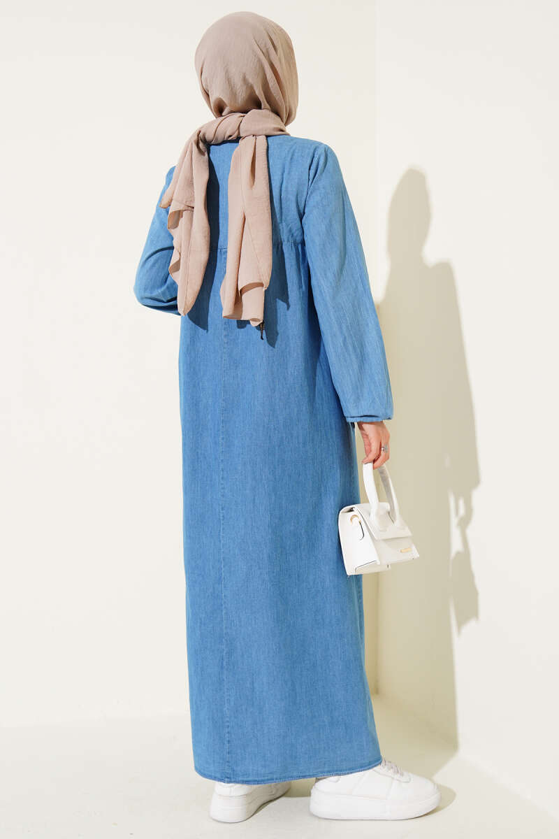 Zahmetsiz şıklığın adı olan kot ebiseler ile  kombininiz hazır. Boydan olan kot elbisede 5 düğme bulunmaktadır. Bilekleri lastikli ve esnektir. Salaş bir kesime sahip olan elbise oldukça rahat ve şıktır. Yeni sezonun trend parçaları arasında yerini almaktadır.
