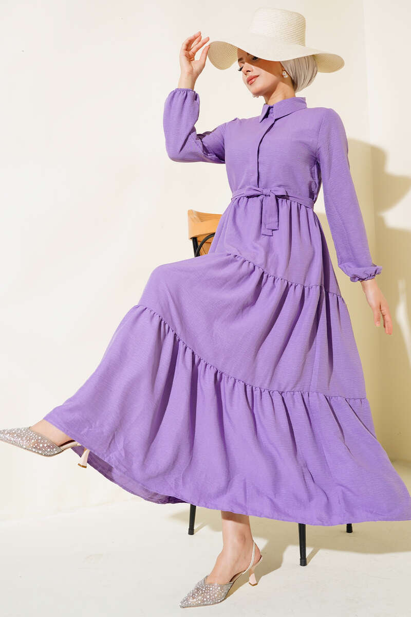 Bu yaz çok dikkat çekecek elbisemiz patlıdır.. Elbisemizin üst kısmında düğmeler bulunmaktadır. Terikoton kumaştan yapılmıştır. Bilekleri lastiklidir. Kendi kumaşından kuşağı bulunan elbisemiz bu yazın en şık modellerindendir. Broş aksesuar olarak kullanılmıştır.