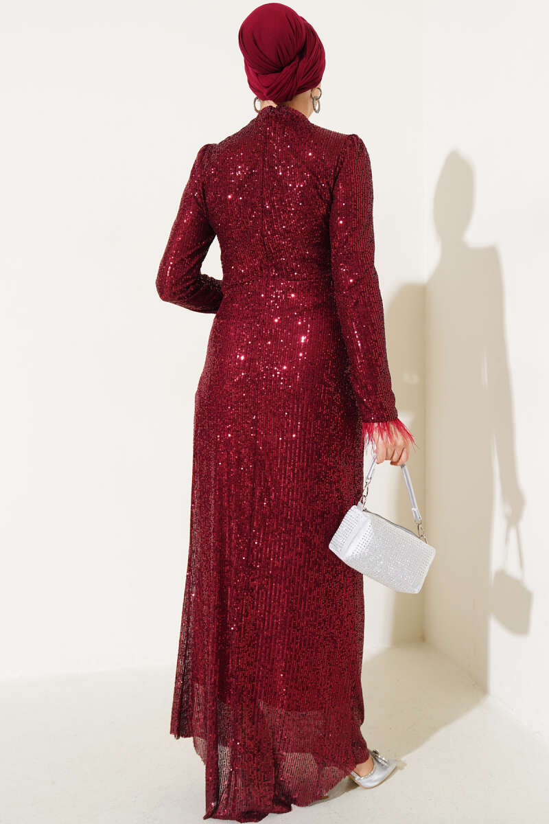 Düğmeli Tensel İnce Kemerli Elbise Bordo