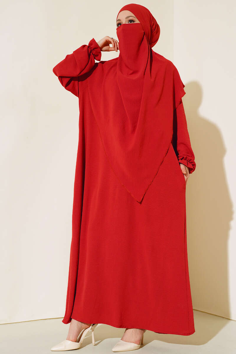 Yeni sezon peçeli ferace elbisemiz sizin için özel olarak tasarlandı. Elbisemiz oval yakadır. Bileklerinde lastik detayı olan elbisemiz iki adet cebe sahiptir. Cepleri kullanılabilmektedir.