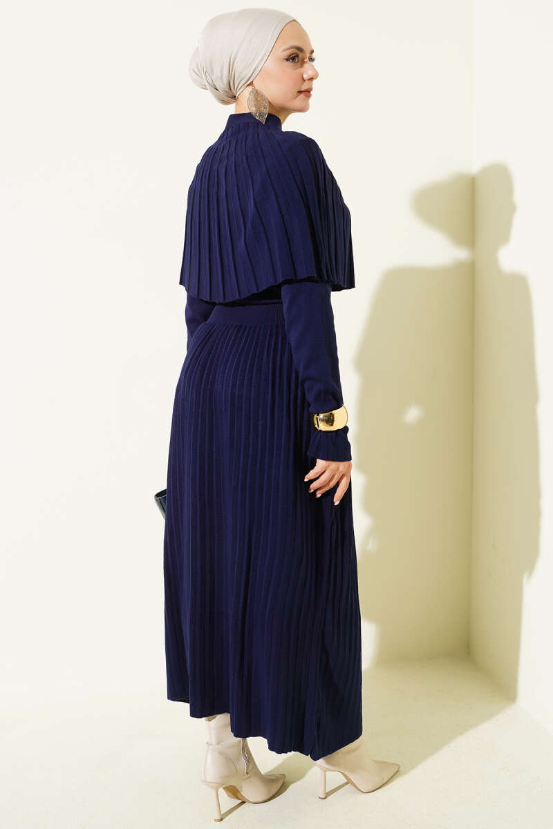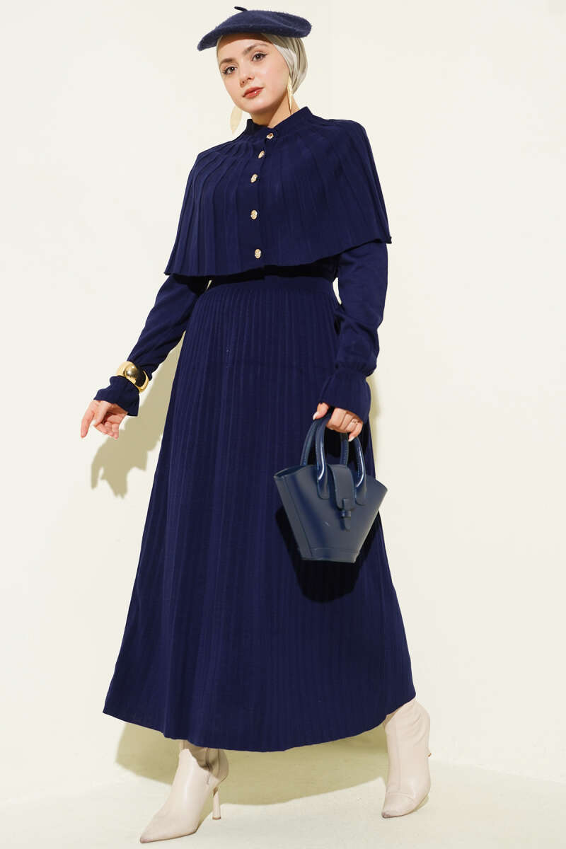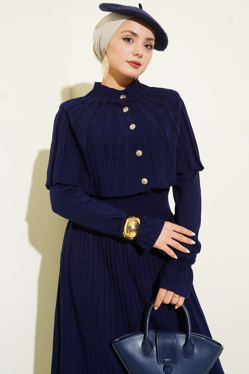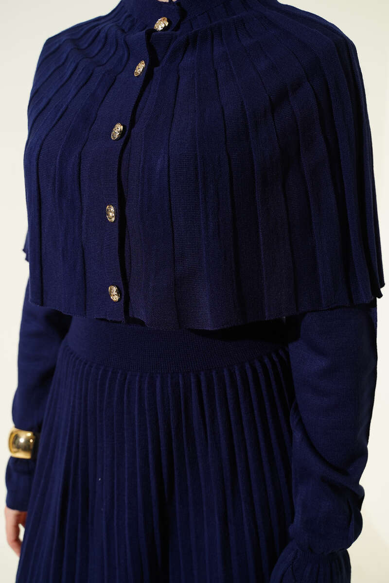 Pelerin Detaylı Düğmeli Triko Elbise Siyah