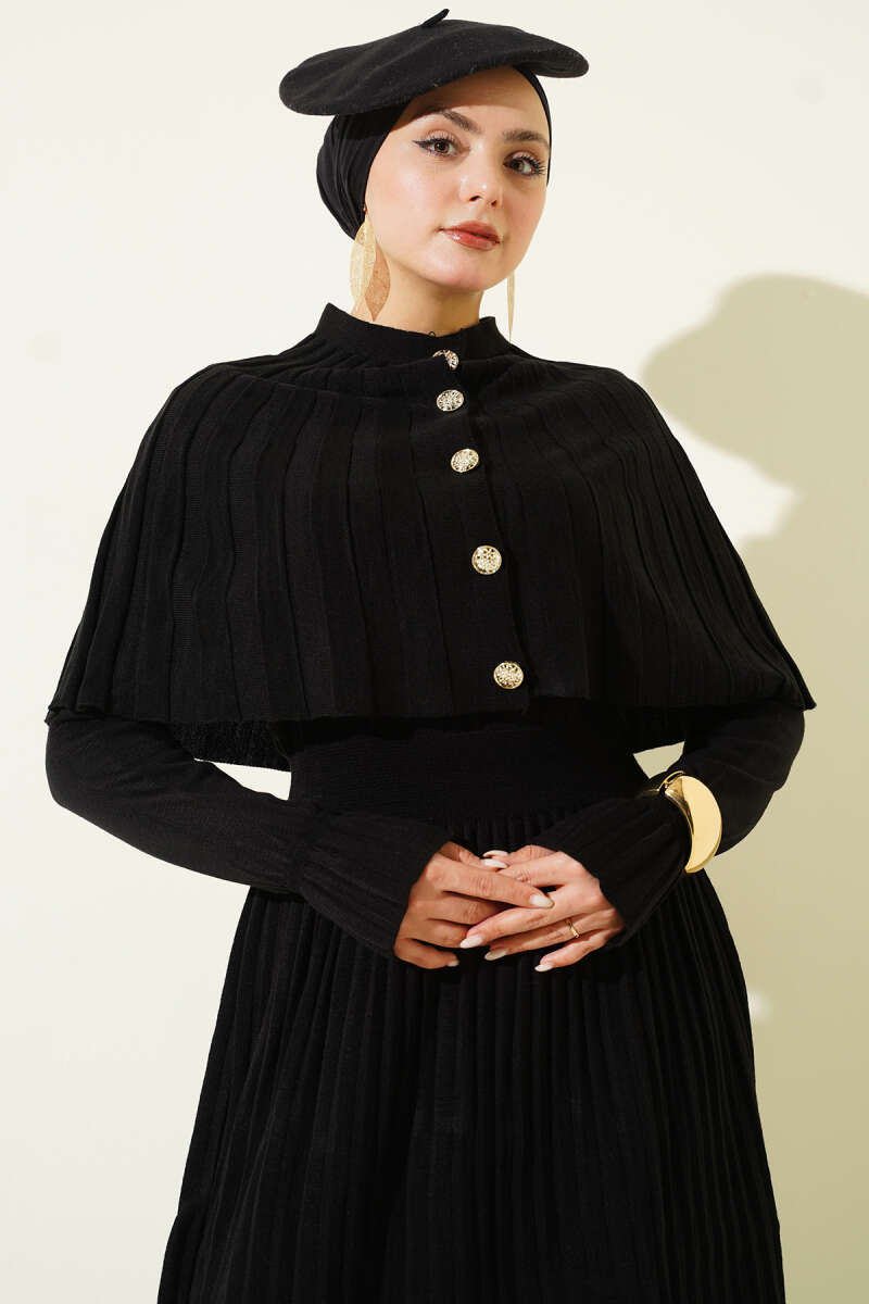 Pelerin Detaylı Düğmeli Triko Elbise Kahve