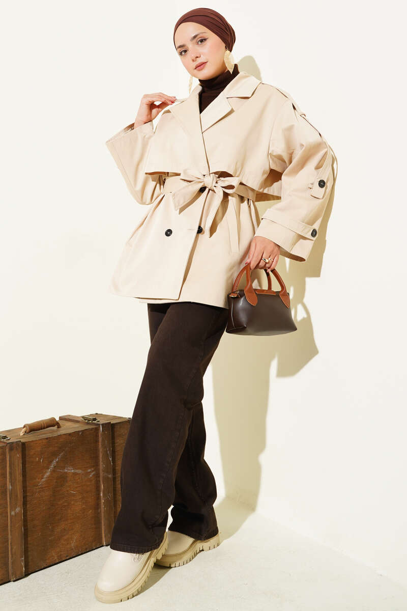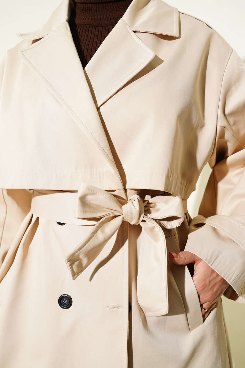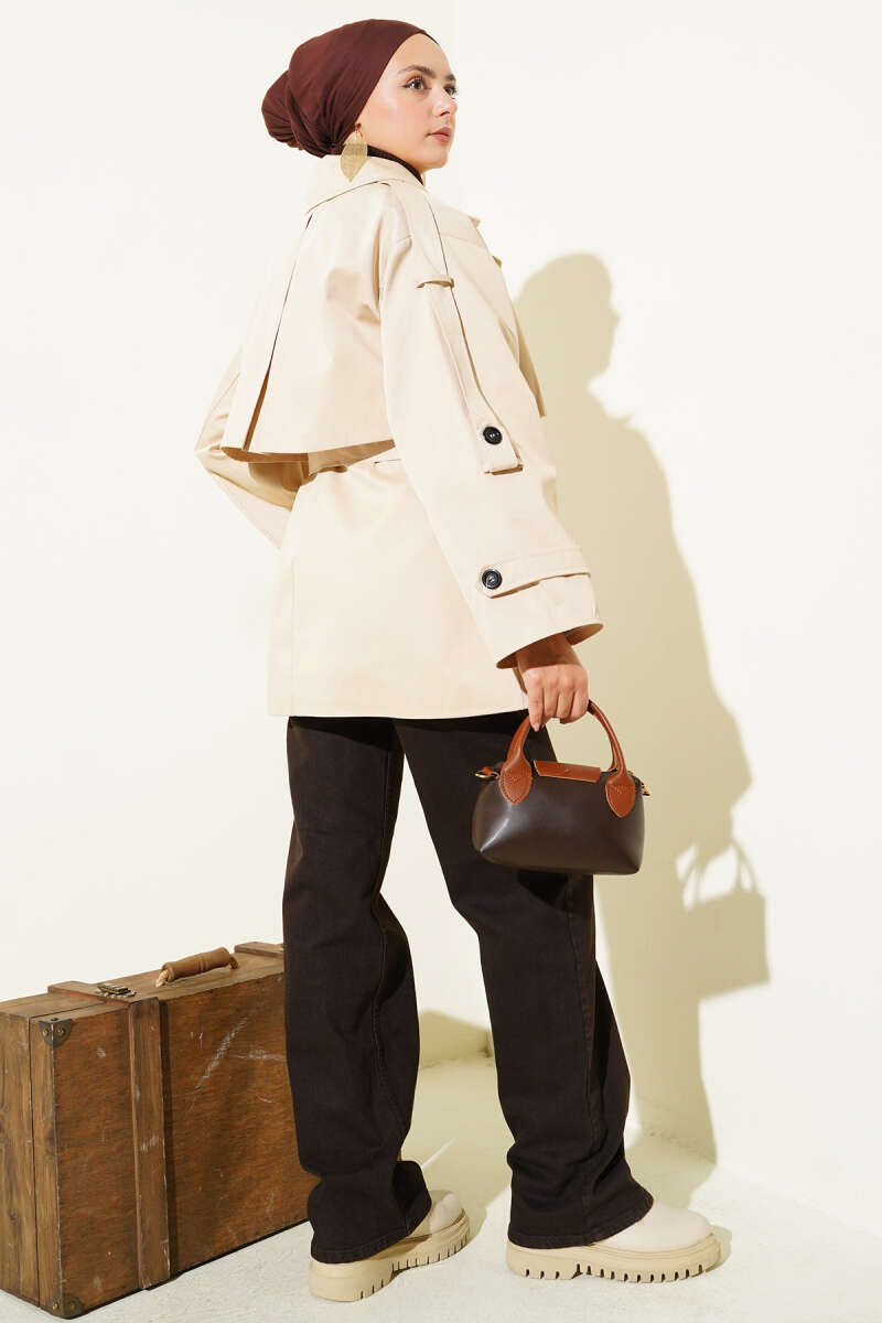 Pelerin Detaylı Kuşaklı Kısa Trençkot Bej