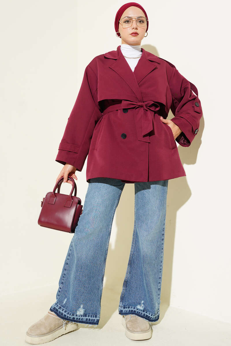 Çift Cepli Kuşaklı Kot Trençkot Füme